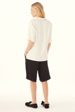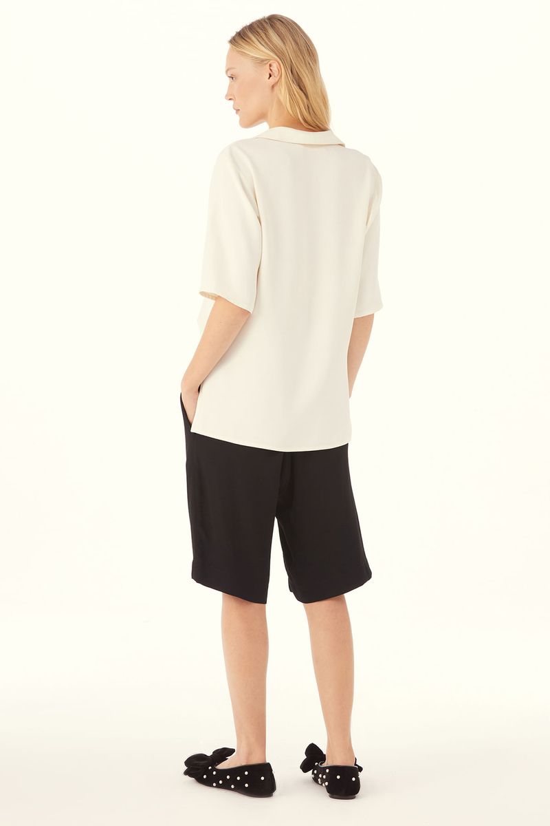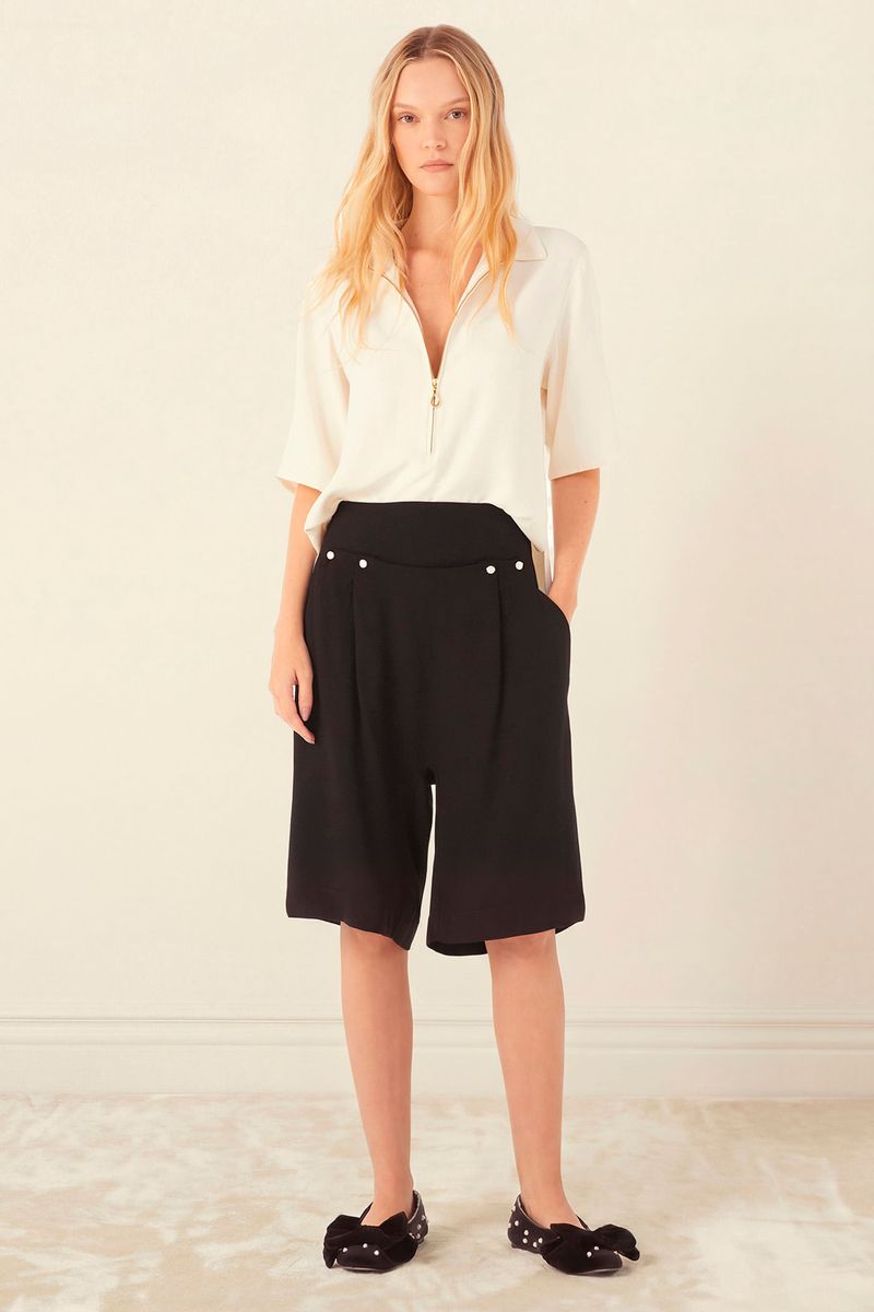A Bermuda Argento traduz a alfaiataria contemporânea com presença discreta, onde precisão e conforto caminham juntos. Confeccionada em Quebec, crepe de viscose, pouco encorpado e fluido, revela toque macio e movimento natural no caimento. A cintura média posicionada logo abaixo do umbigo desenha um shape próximo ao corpo com leve saruel. Enquanto o caimento frontal com botões perolados organiza a construção e pontua o acabamento, com bolsos laterais embutidos e fechamento lateral garantindo uma leitura limpa e precisa, arrematada por bainha aplicada na barra.