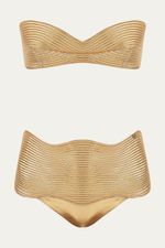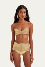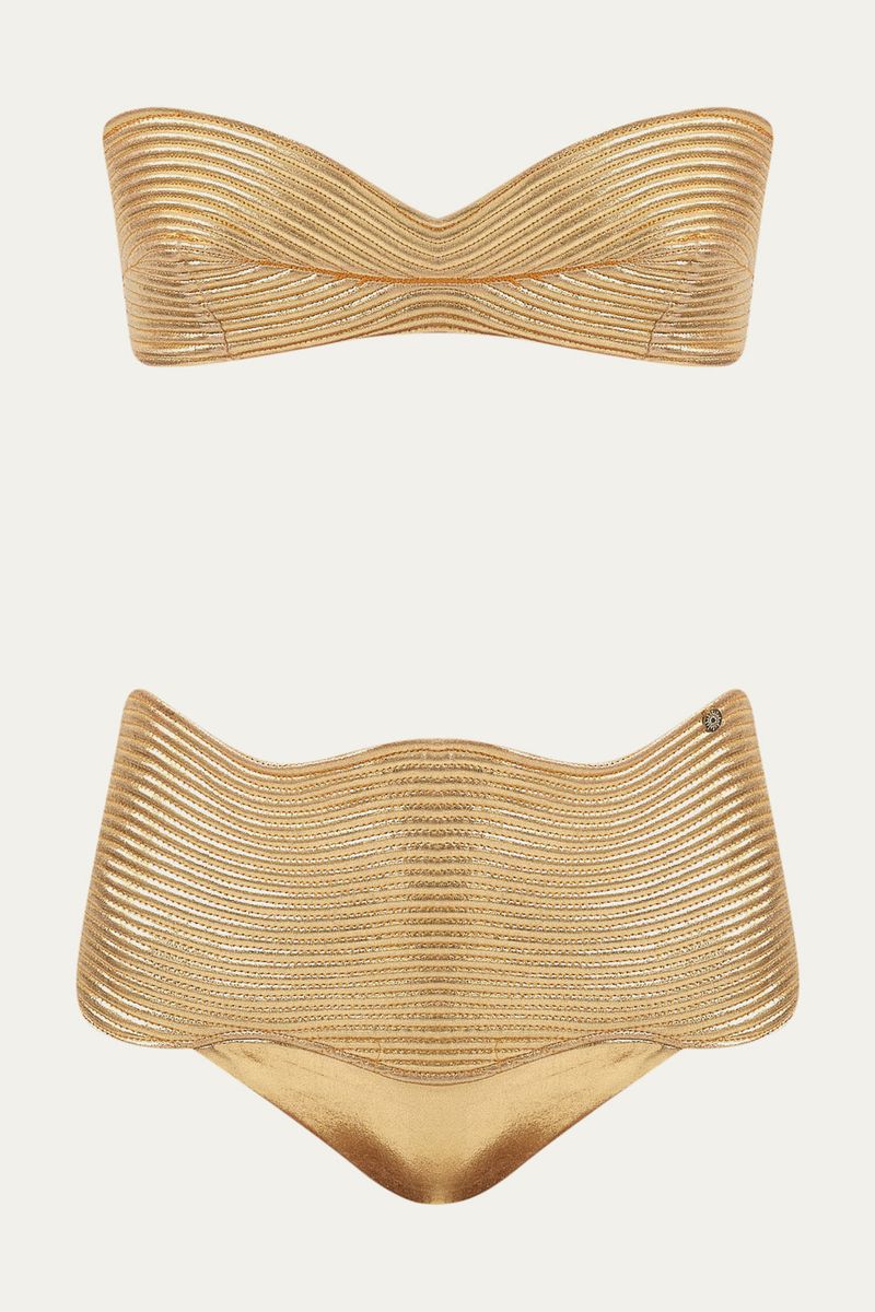 O Biquini Hot Pants Sole Suntime uma peça autoral de edição limitada, confeccionado em malha metalizada com um exclusivo matelassê feito à mão que cria uma textura de ondas. Este conjunto, com seu top tomara-que-caia sem bojo e calcinha hot pant, oferece um toque de estilo e sofisticação inigualáveis.