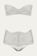 O Biquini Hot Pants Stella Suntime uma peça autoral de edição limitada, confeccionado em malha metalizada com um exclusivo matelassê feito à mão que cria uma textura de ondas. Este conjunto, com seu top tomara-que-caia sem bojo e calcinha hot pant, oferece um toque de estilo e sofisticação inigualáveis.