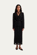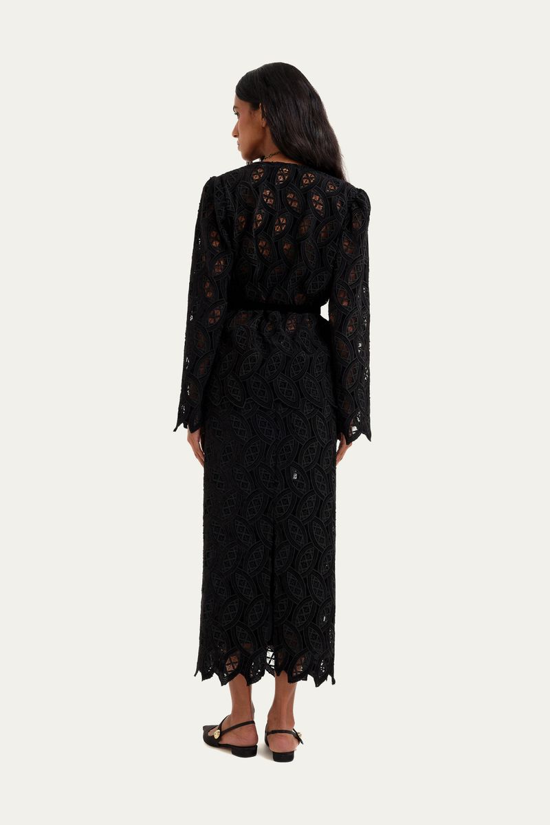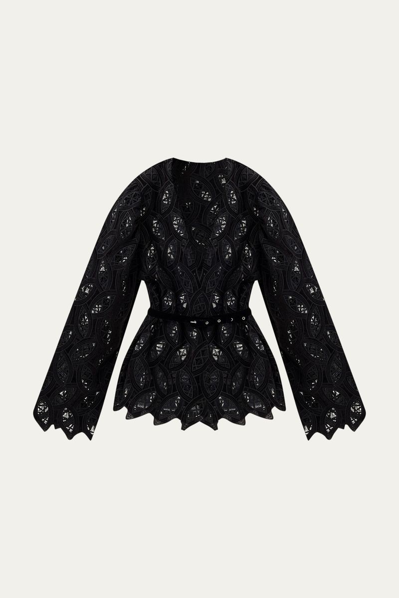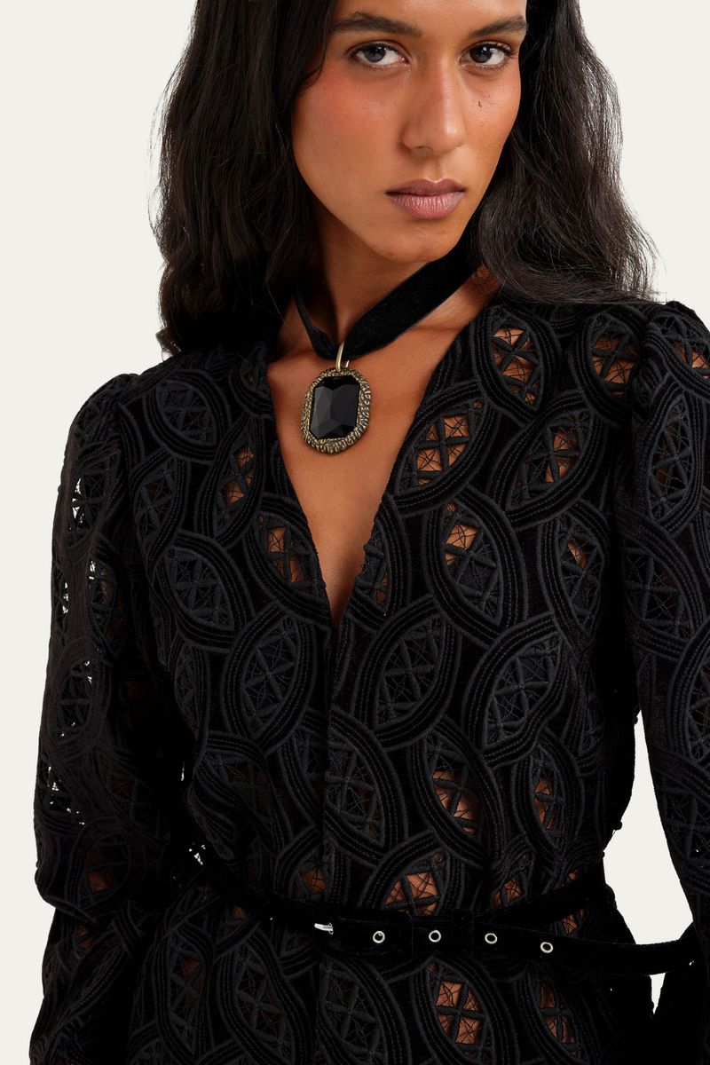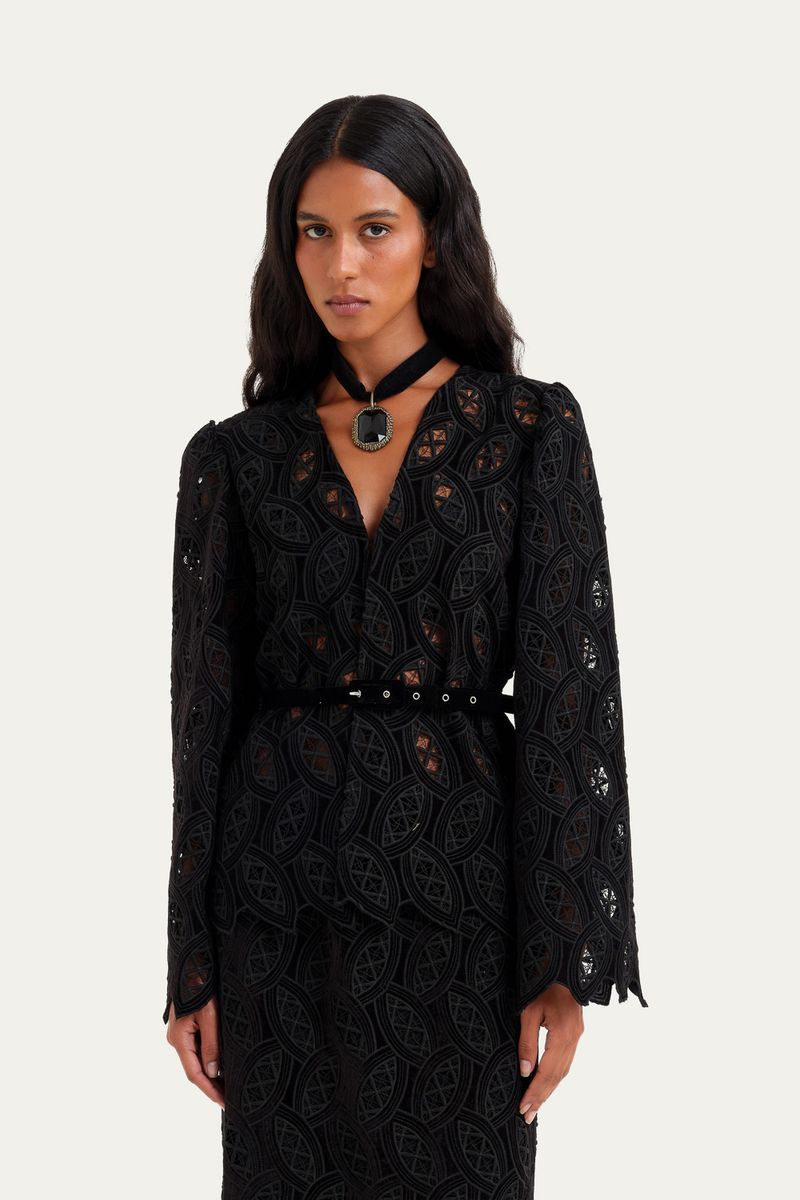 A Blusa Josephine Linnen, confeccionada em um veludo suntuoso, destaca-se pela sua modelagem reta e pelo decote em V. As mangas compridas são complementadas por ombreiras discretas, estruturando o caimento da peça. Detalhes de bordados vazados adornam o tecido, e a blusa é finalizada com um cinto fino em veludo, que permite um ajuste delicado à silhueta.