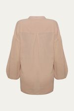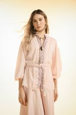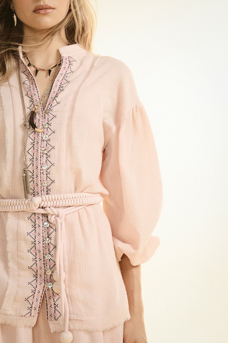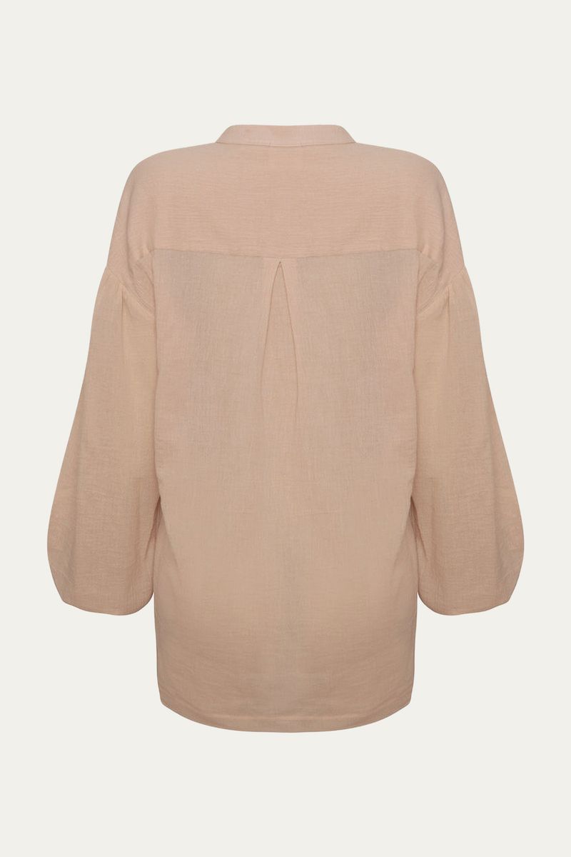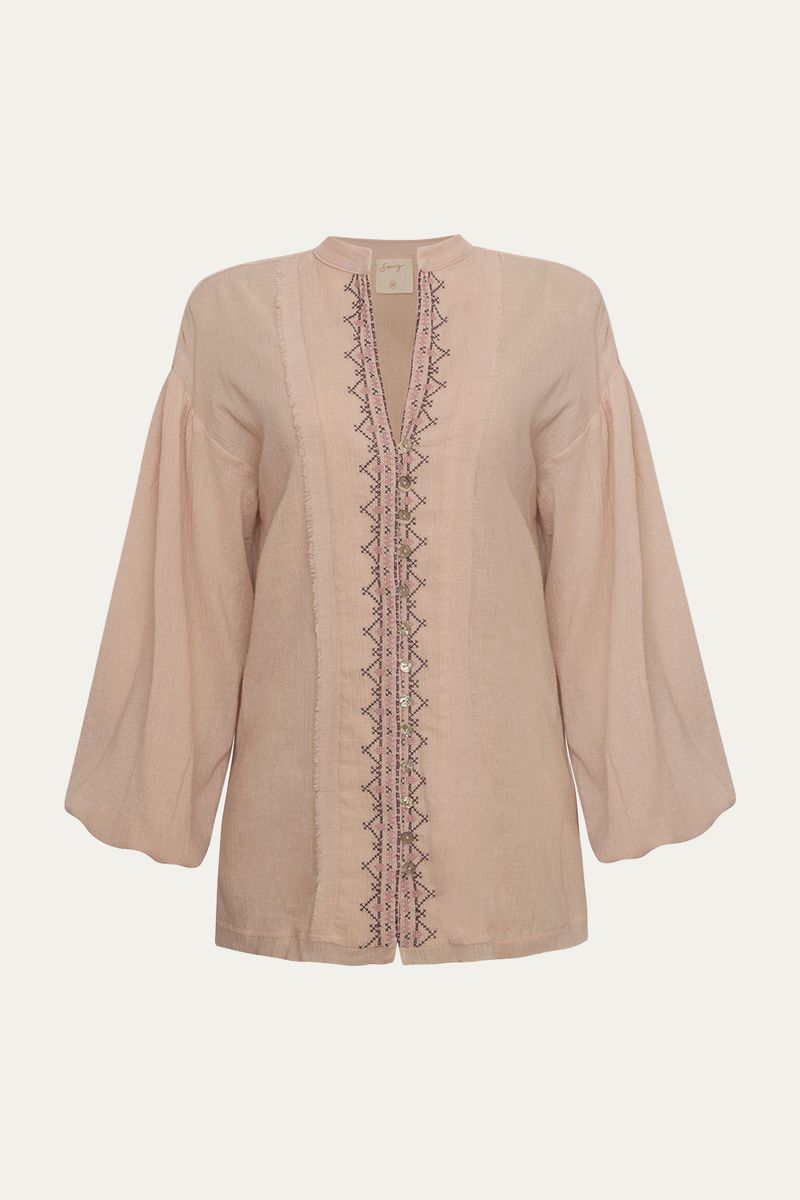 Camisa de modelagem levemente evasê, com mangas longas bufantes, confeccionada em gaze. Possui elástico embutido na manga. Bordado de ponto cruz na vista, fechamento frontal por botões de madreperola. 100% algodão