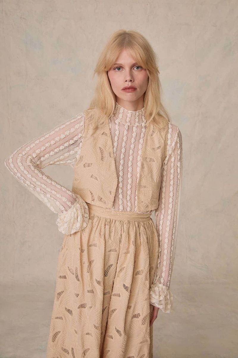 Envolva-se na delicadeza da Blusa Segunda Pele New Jelly Paula Raia, sua modelagem slim esculpe a silhueta com graciosidade. A gola alta e as mangas longas culminam em punhos com peplum, um detalhe que confere um movimento sutil e inesperado.