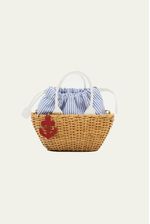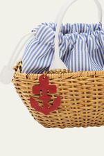 Bolsa em vime. Modelo estruturado. Formato de cesto. Alça de mão fixa. Alça transversal de corrente removível. Forro em tecido. Acompanha chaveiro de âncora. Fechamento em cordão enforcador.