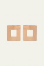 Brinco produzido em liga metálica, com banho dourado. A peça é composta por chapa de formato de retangular grande com recorte no centro, acabamento polido e fecho posterior por tarraxa.