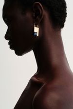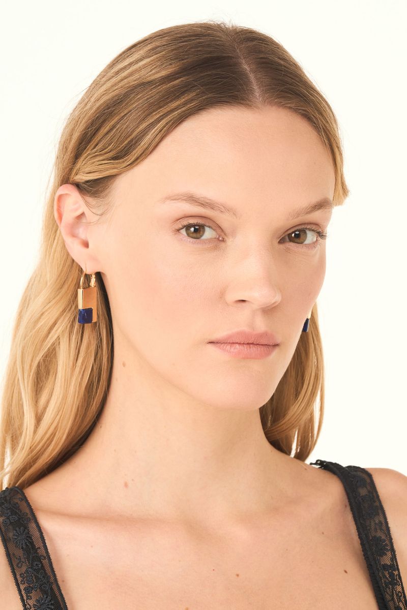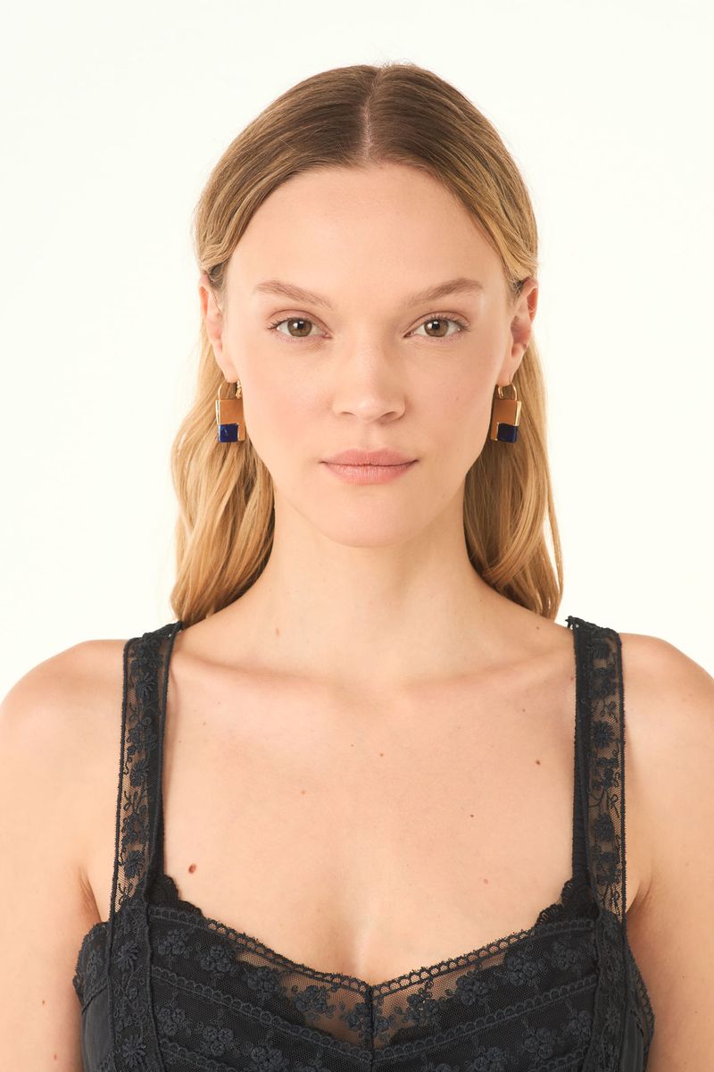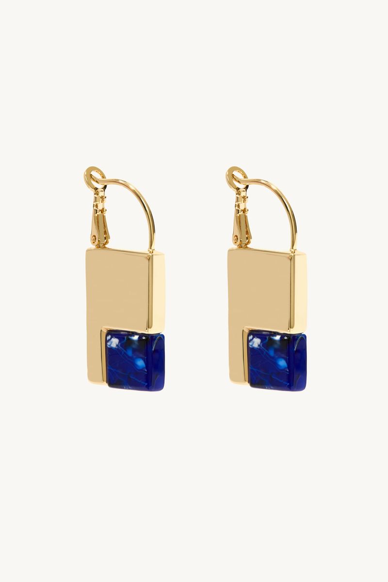 O brinco Silvestre CRIS BARROS é contemporâneo e elegante. Possui design geométrico exclusivo, desenvolvido em nosso atelier, com formas retângulares de resina lapida azul e gancho e trava de segurança embutidos banhados à ouro.