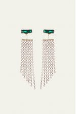 Brinco de metal com cristais. Peça possui base de cristal verde e franja de cristais com ponta alongada. Fechamento posterior por tarraxa.