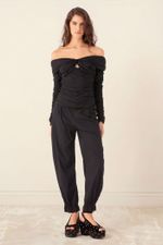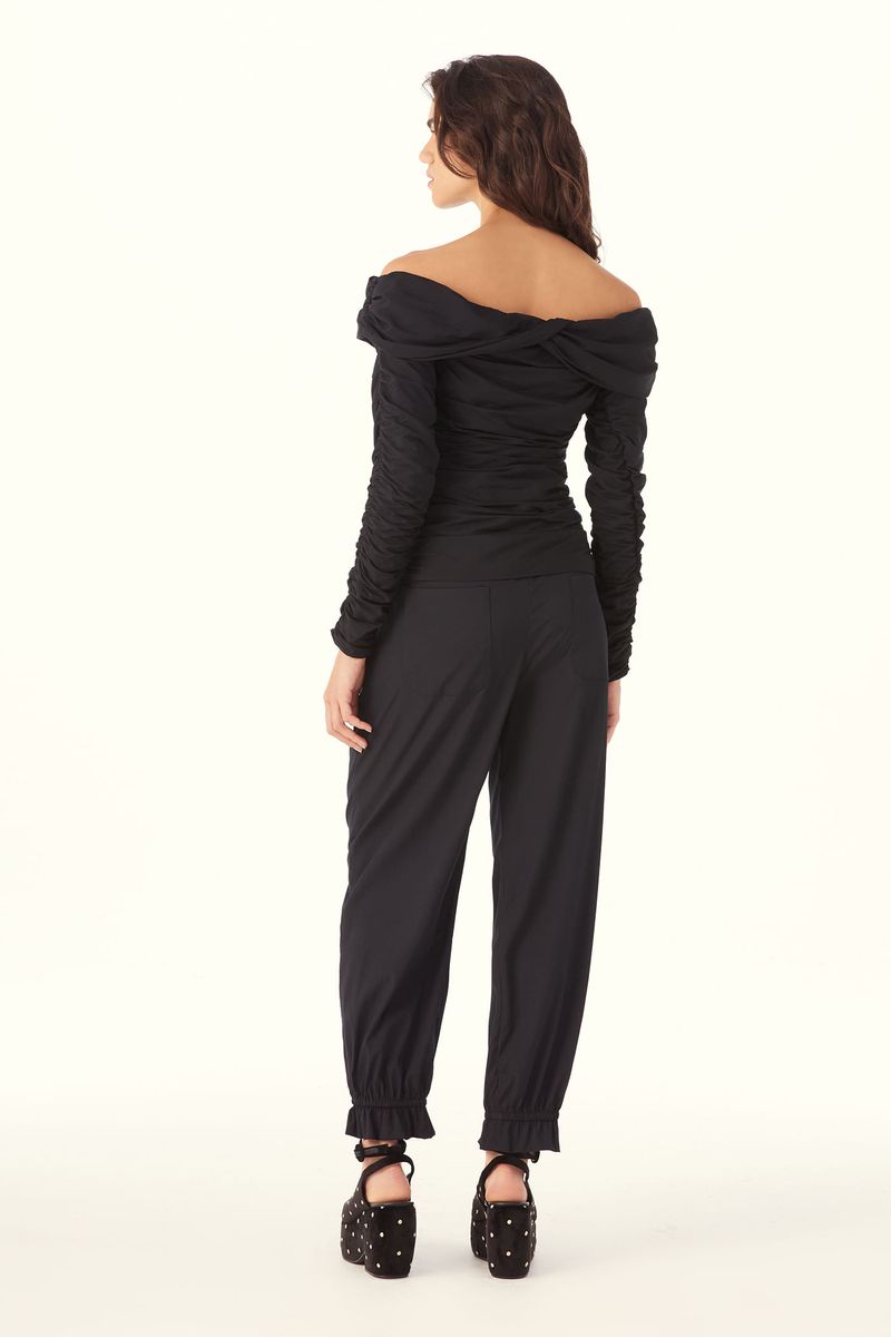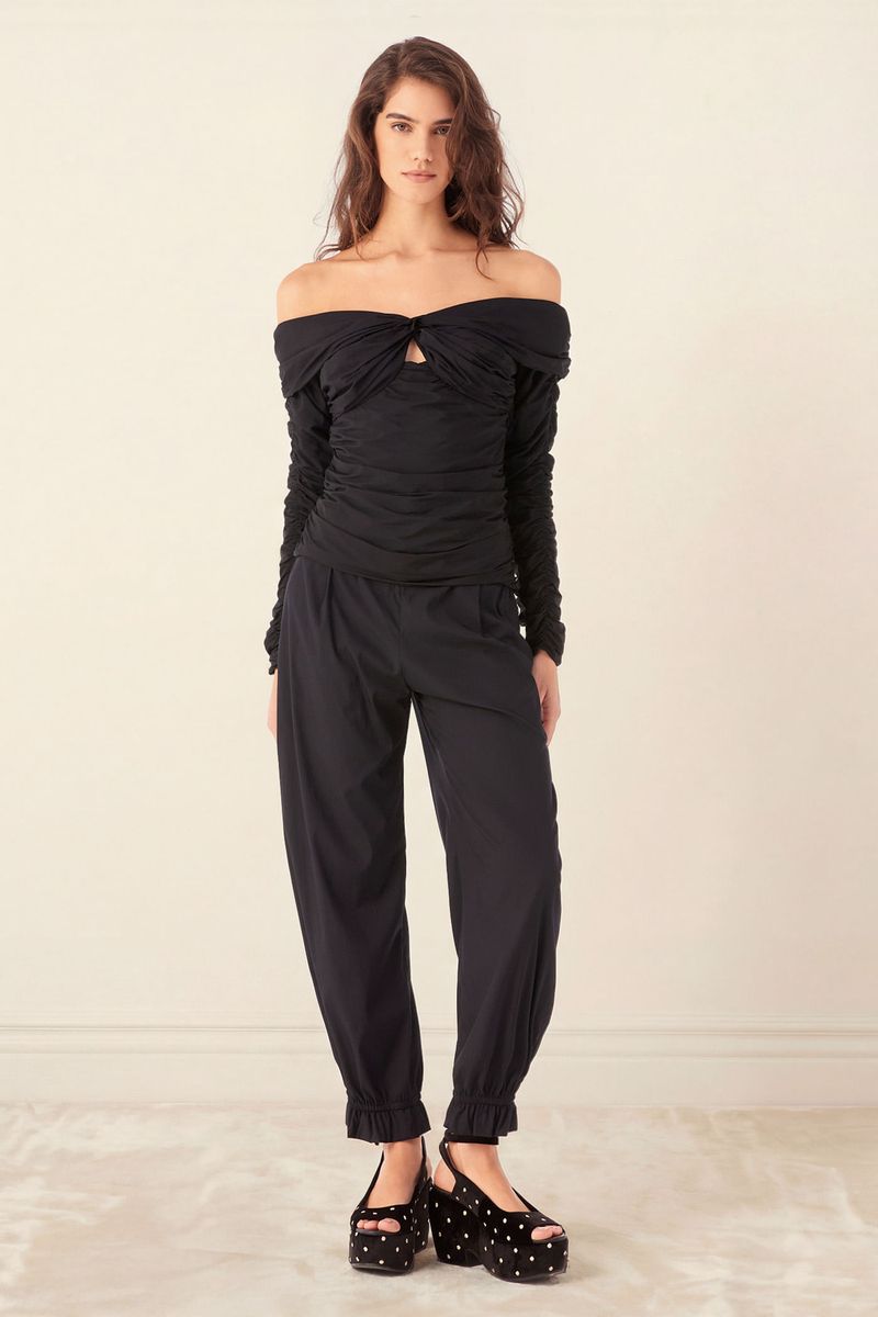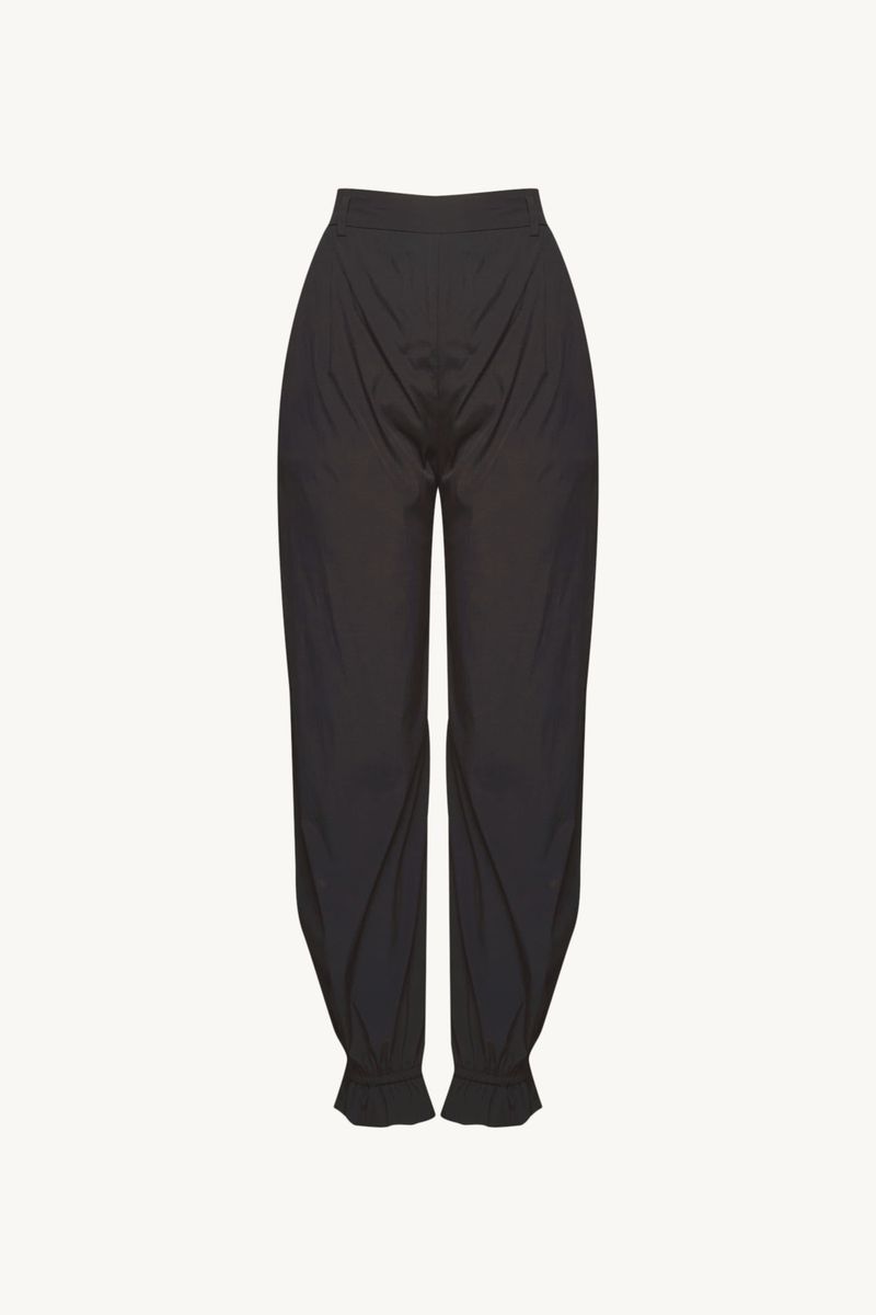 A Calça Alessandra traduz uma elegância contemporânea, onde fluidez e construção se encontram em harmonia. Confeccionada em Eugênia, Tecido em TENCEL™Modal, feito com fibra renovável de manejo florestal certificado e tecnologia ecoeficiente de ciclo fechado que recircula água e solventes, revelando toque macio e drapeado que acompanha o corpo. A cintura média, posicionada logo abaixo do umbigo, combina cós com elástico nas costas e fechamento por zíper lateral, enquanto os bolsos embutidos mantêm a funcionalidade discreta e o comprimento no ossinho é arrematado por barra com elástico embutido e babado, criando um caimento levemente abaulado e traços modernos com assinatura CRIS BARROS.