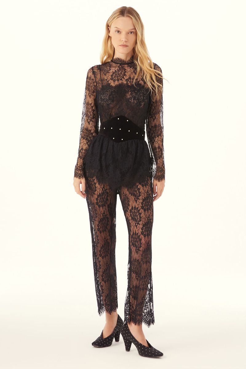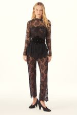 A Calça Andare traduz feminilidade com precisão, onde tradição e olhar contemporâneo se encontram em equilíbrio. Confeccionada em Lilly, renda de desenho paisley, rica e ornamental, que ecoa os têxteis decorativos clássicos vistos nos interiores milaneses, reinterpretada com leveza e modernidade, ela traduz o encontro entre tradição, arte e o olhar contemporâneo da coleção Grazie. A cintura muito alta e o caimento próximo ao corpo definem a silhueta com exatidão, enquanto a basque do próprio tecido estrutura a linha da cintura, com barrado localizado que arremata a barra da calça e da basque com desenho preciso, acompanhada de hot pants para acabamento e segurança na construção.
