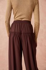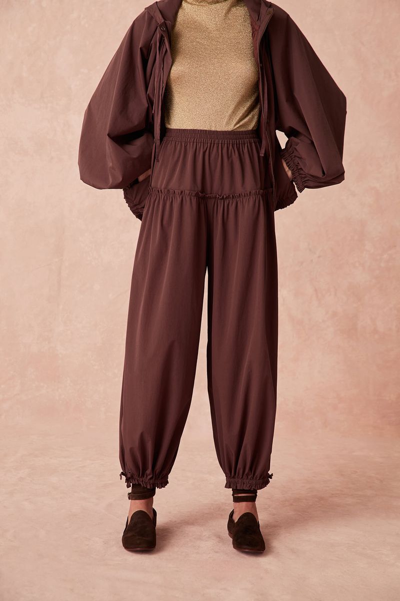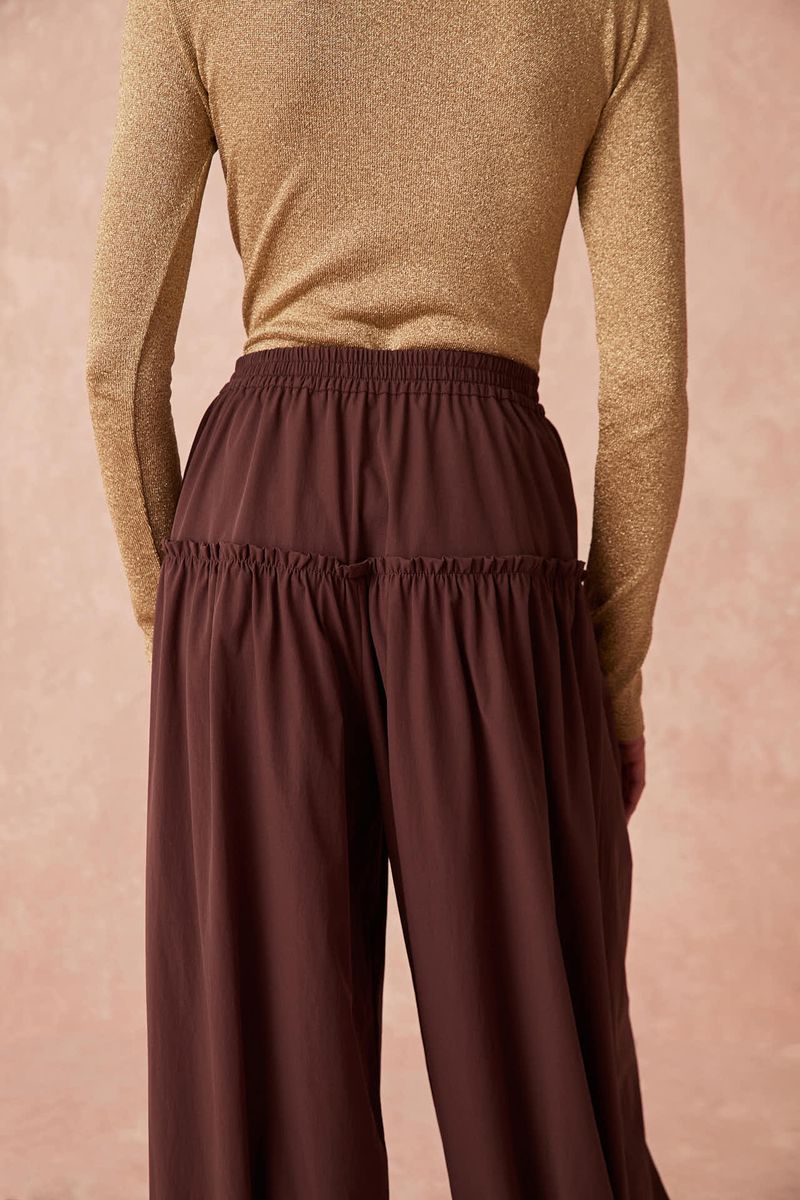 Esta calça balone apresenta-se na sofisticada tonalidade MARROM, revelando um caimento impecável e um toque suave. Sua modelagem de cintura alta, adornada por delicados franzidos no cós e na barra, confere à peça um visual contemporâneo e elegante, ideal para quem busca conforto e estilo.