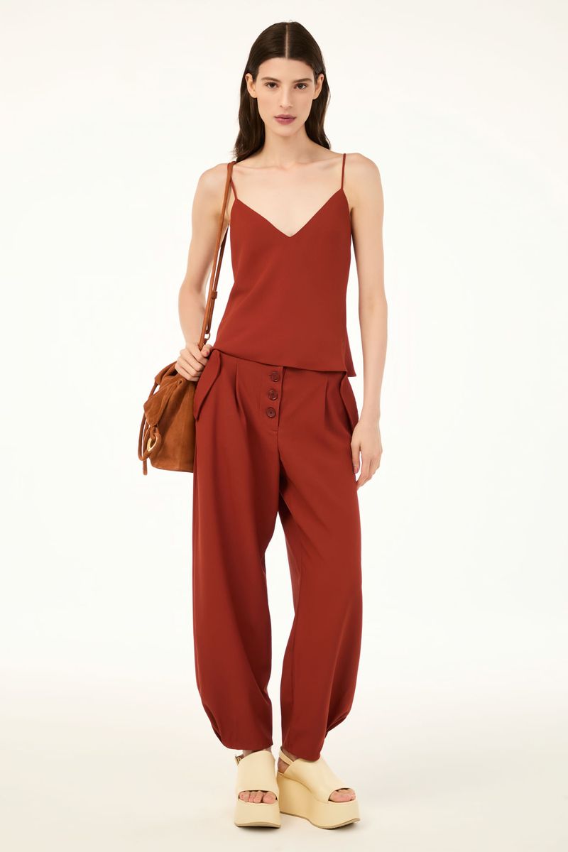 A calca Balsamo CRIS BARROS é estilosa e atemporal. De Avalon, nosso tecido clássico, encorpado e fluido, perfeito para alfaiataria e que possui certificação FSC, com maior responsabilidade ambiental, suas fibras são feitas a partir do manejo sustentável de áreas reflorestadas.calça em avalon, nosso tecido de crepe. Possui shape abaulado, cintura alta, bolsos laterais funcionais com lapela, e de vivo posteriores, fechamento por botões esmaltados, fivela nas costas para melhor ajuste e comprimento no ossinho.