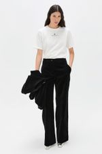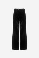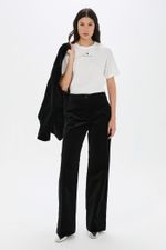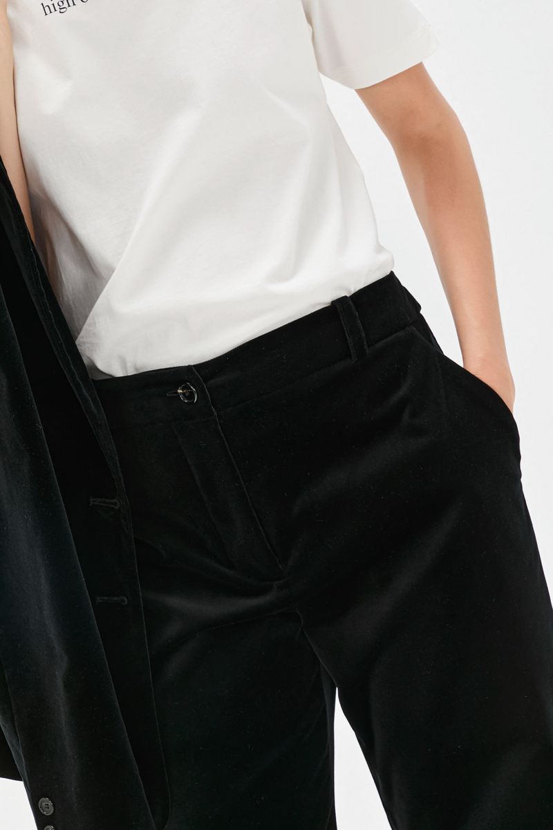 A calca Bueno CRIS BARROS é elegante e estilosa. De Karim, veludo de algodão com elastano e leve brilho. Possui shape reto, cintura logo abaixo do umbigo, cós com passantes, bolsos funcionais laterais e posteriores, fechamento por zíper de braguilha e botão jóia preto rajado com design exclusivo, desenvolvido em nosso atelier e comprimento longo salto.
