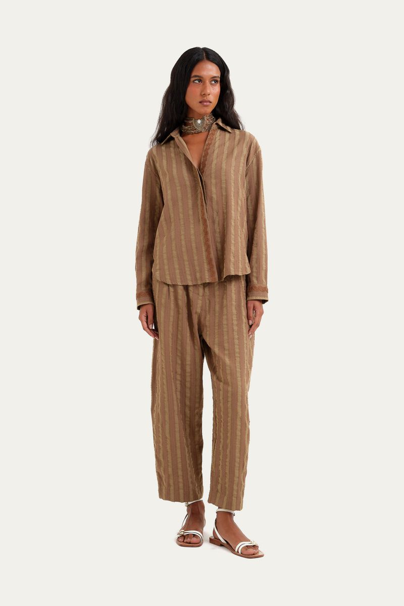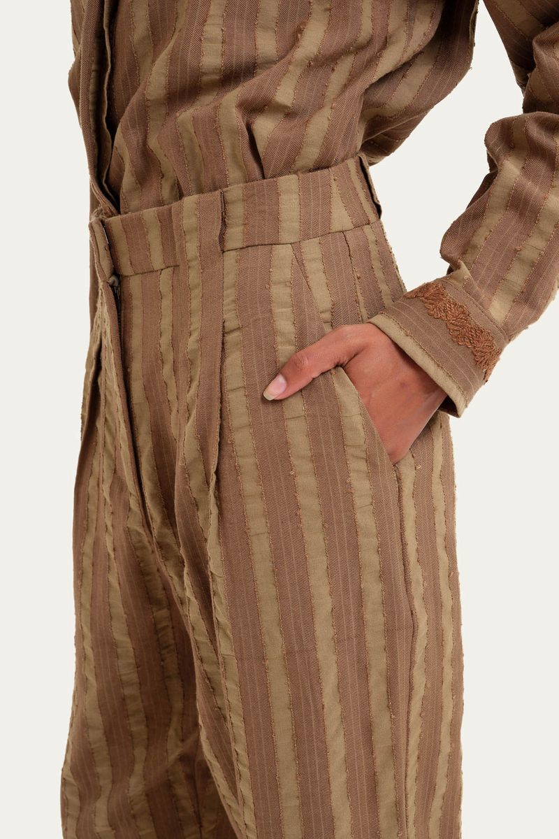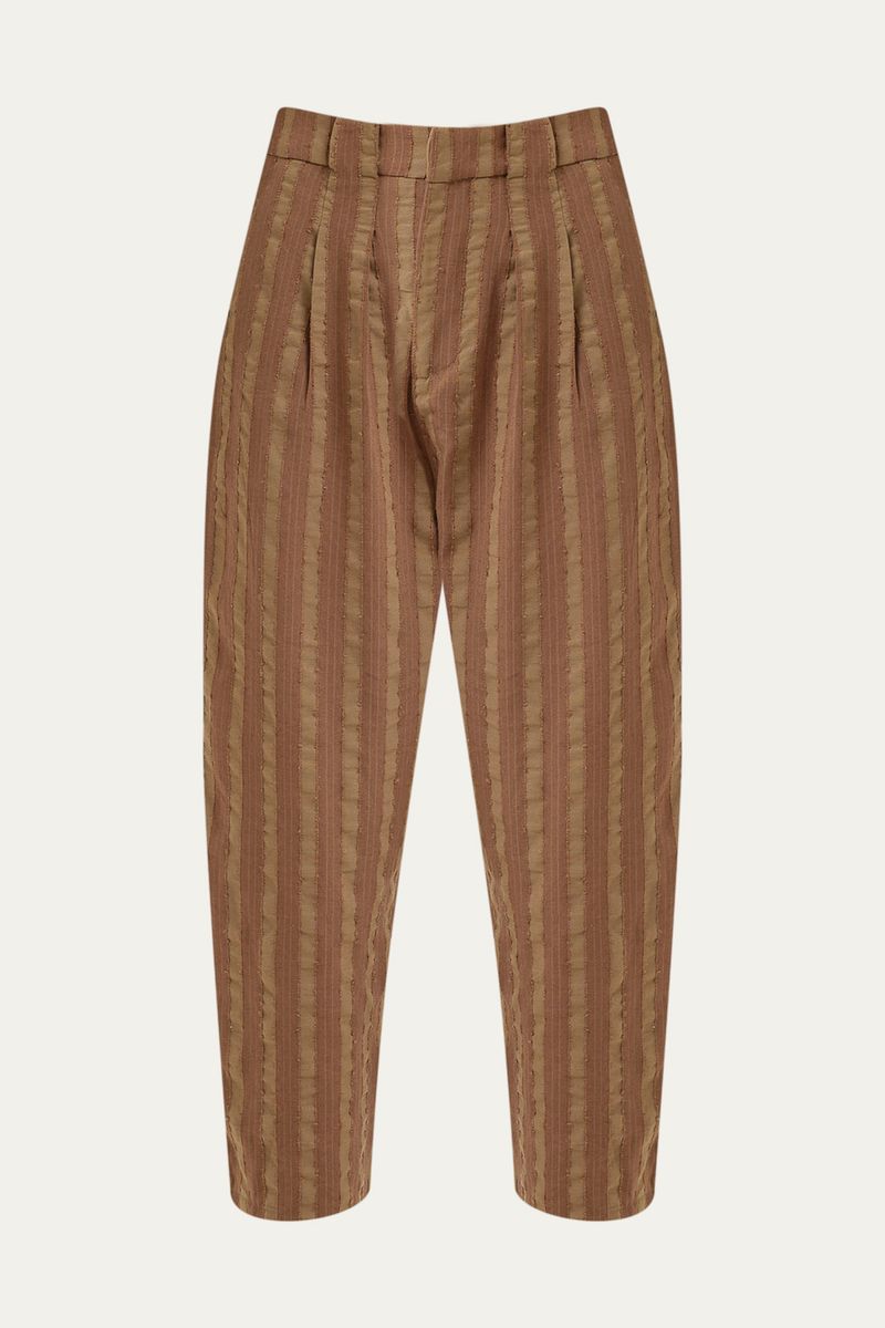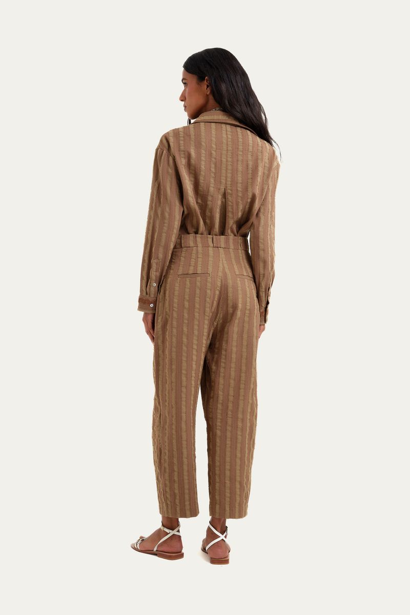 A Calça Flore Linnen, confeccionada em algodão maquinetado, apresenta uma silhueta reta e cintura alta, redefinindo a elegância com discrição. As pregas frontais adicionam um refinamento sutil, complementado pela delicada padronagem em listras que confere um charme atemporal.