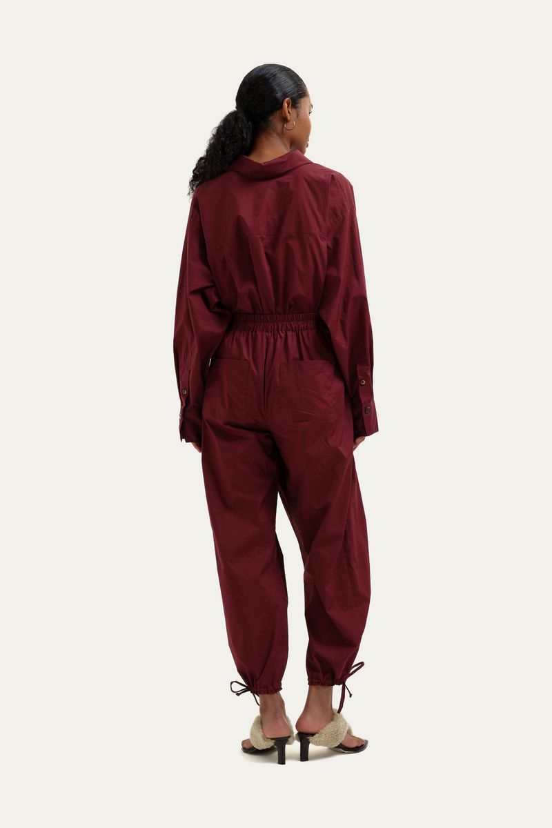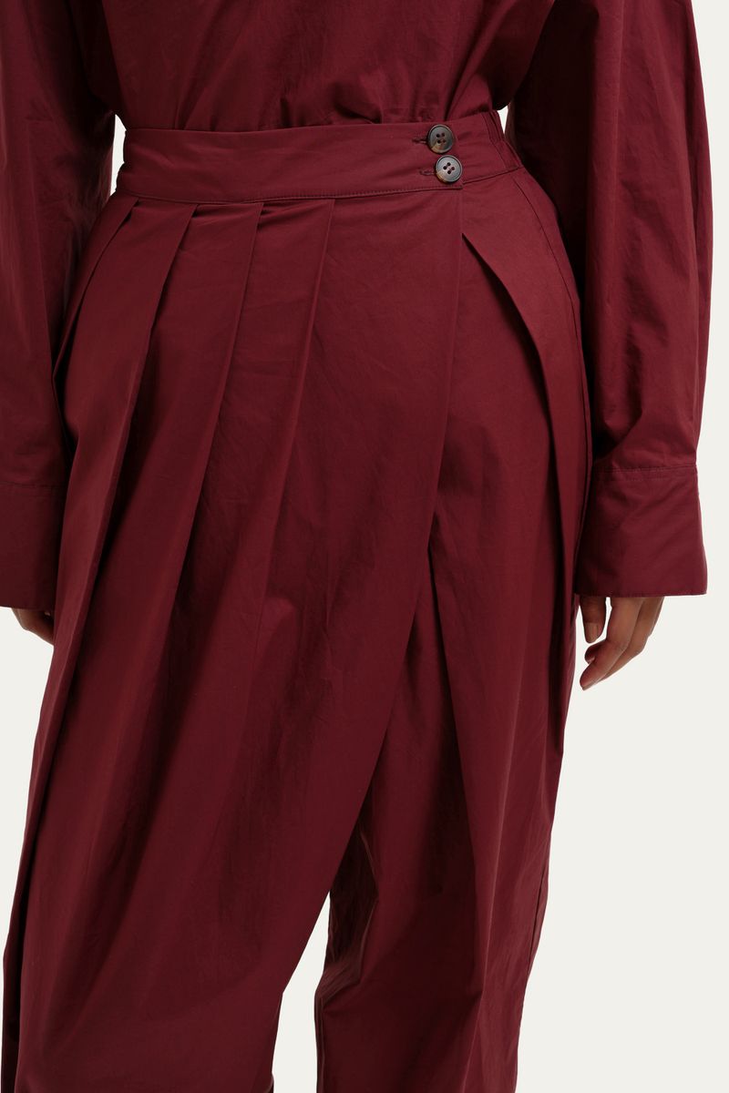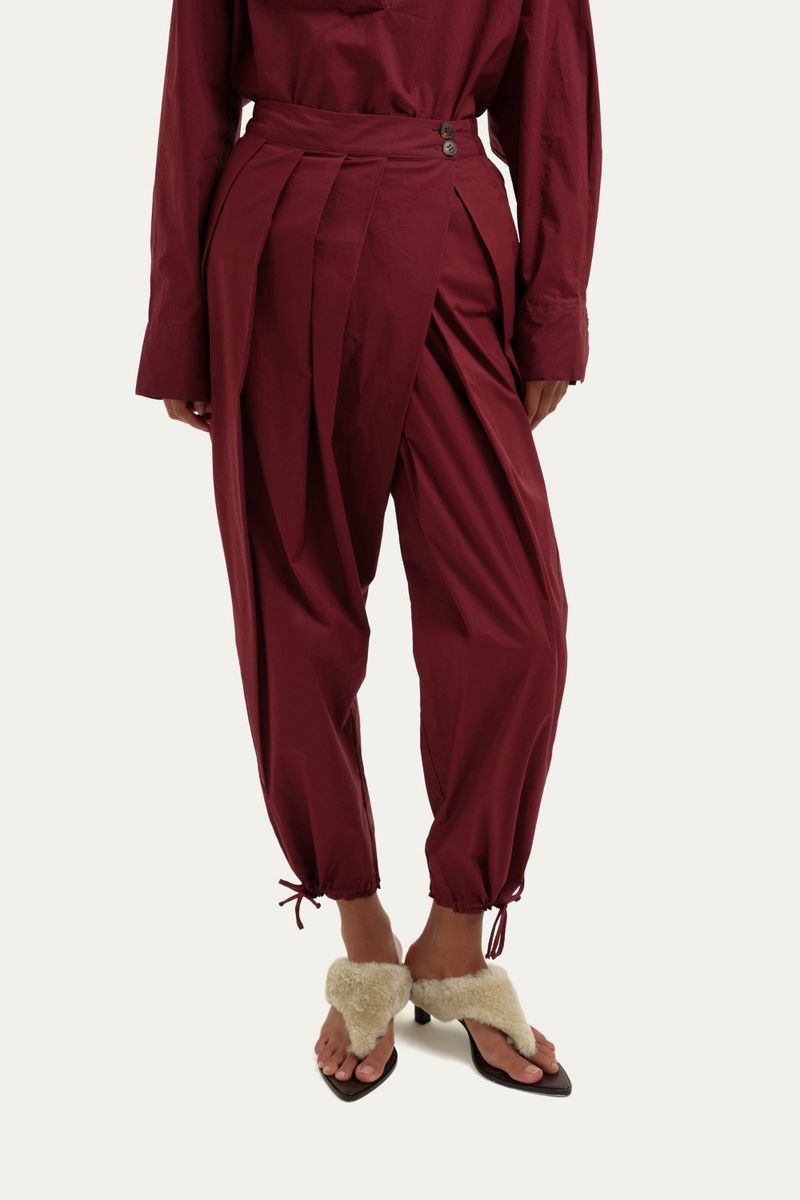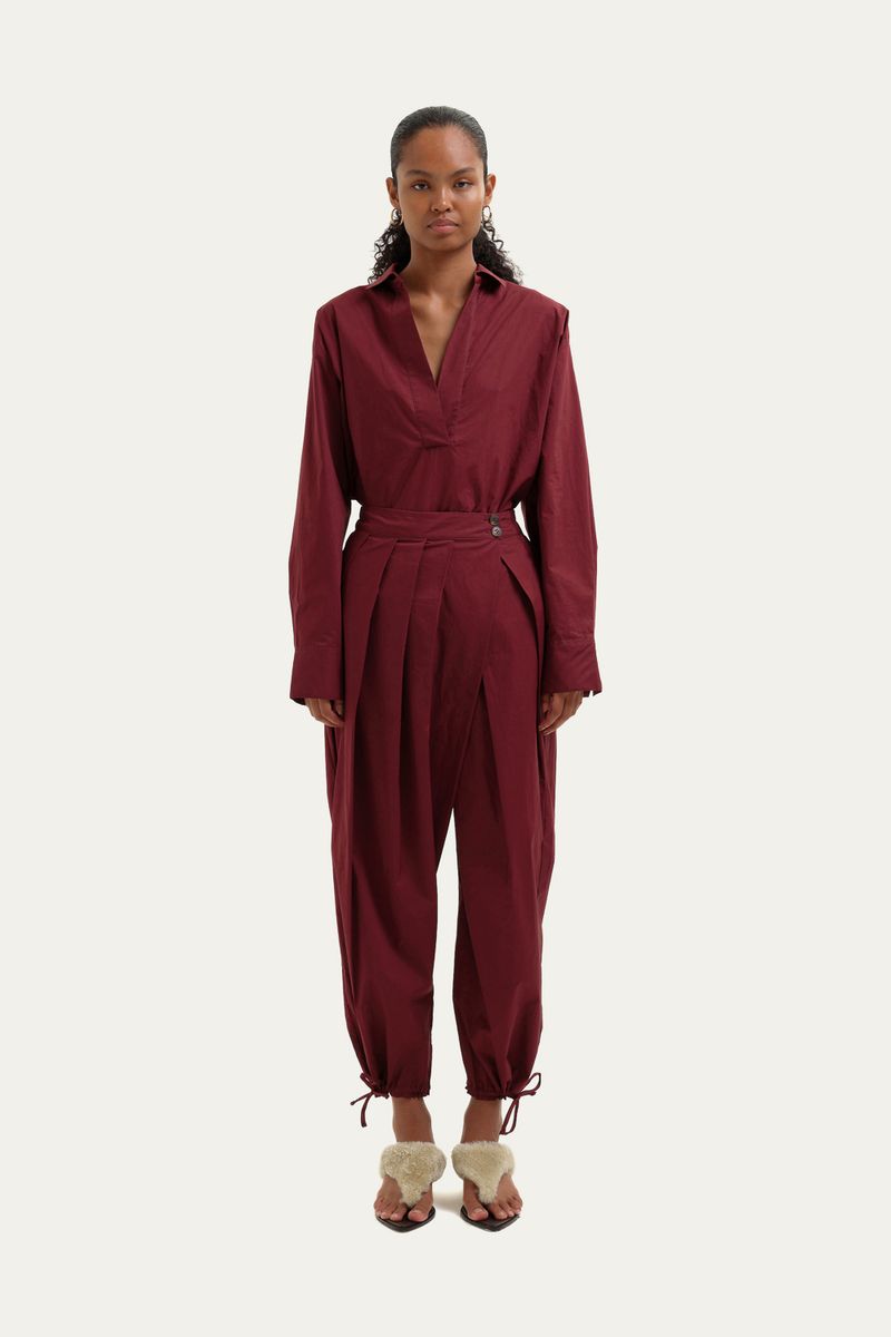 A Calça Gami Framed em tecido plano de algodão oferece um caimento impecável com sua frente de pregas e cós com elástico posterior, garantindo conforto e estilo. Detalhes como a barra com elástico e cordão e os bolsos posteriores adicionam funcionalidade e um toque moderno.