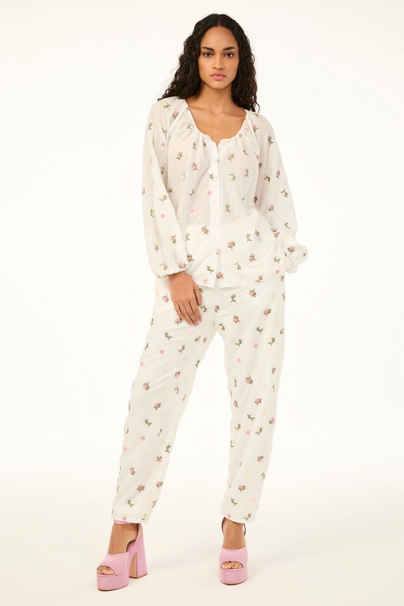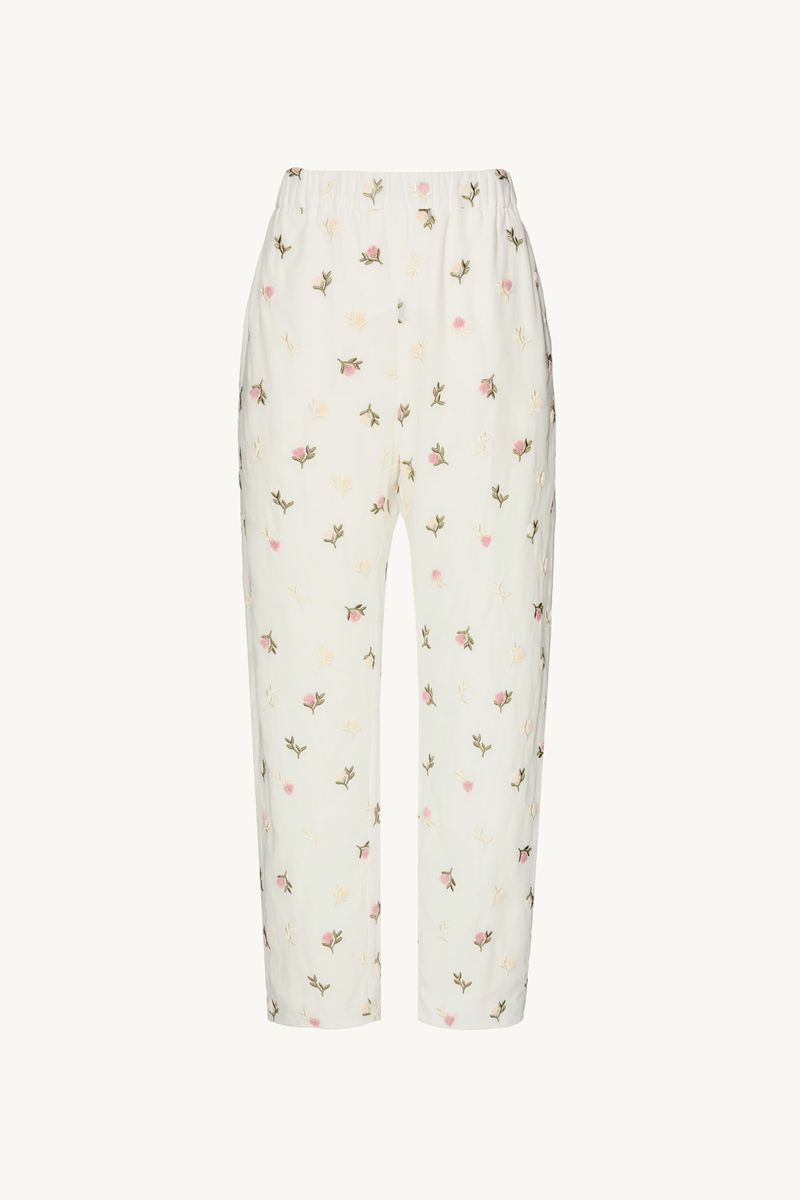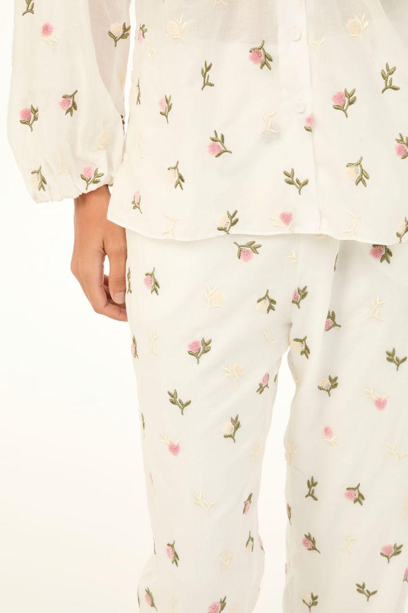 A calca Hibisco CRIS BARROS é fun e delicada. De Bosque, voil 100% algodão, bordado com mini flores de textura atoalhada. Possui shape cenoura, cintura logo abaixo do umbigo, cós de elástico, comprimento no ossinho e fechamento por zíper lateral invisível.