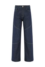 Calça em jeans de algodão. Modelagem wide leg. Cintura alta. Cós com passantes. Bolsos laterais e posteriores. Detalhe em recortes pespontados. Fechamento frontal em botão e zíper.