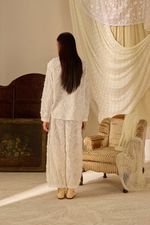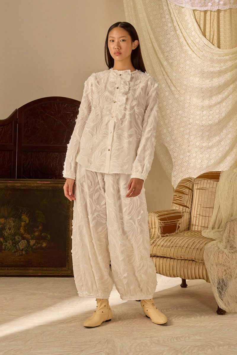 Calça em algodão bordado.