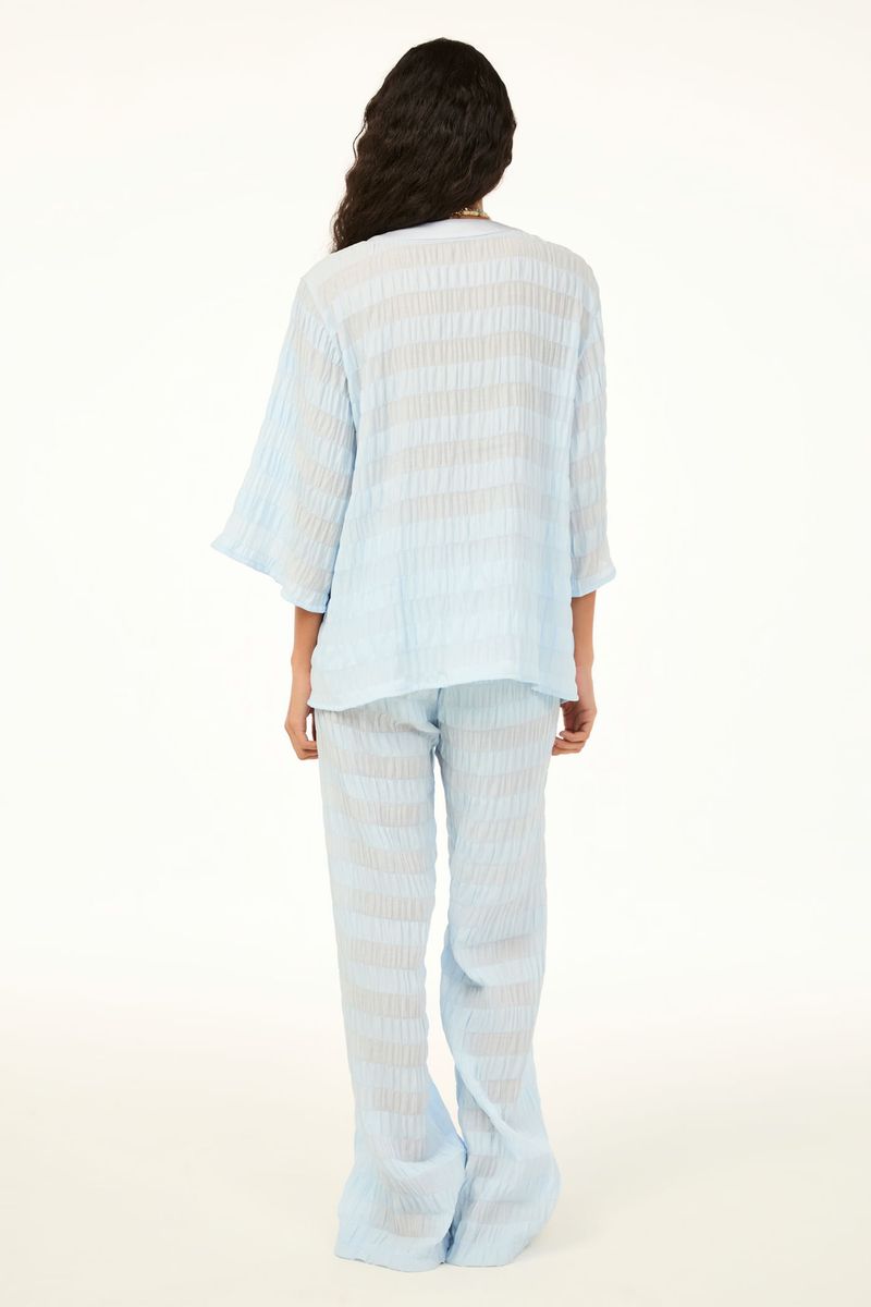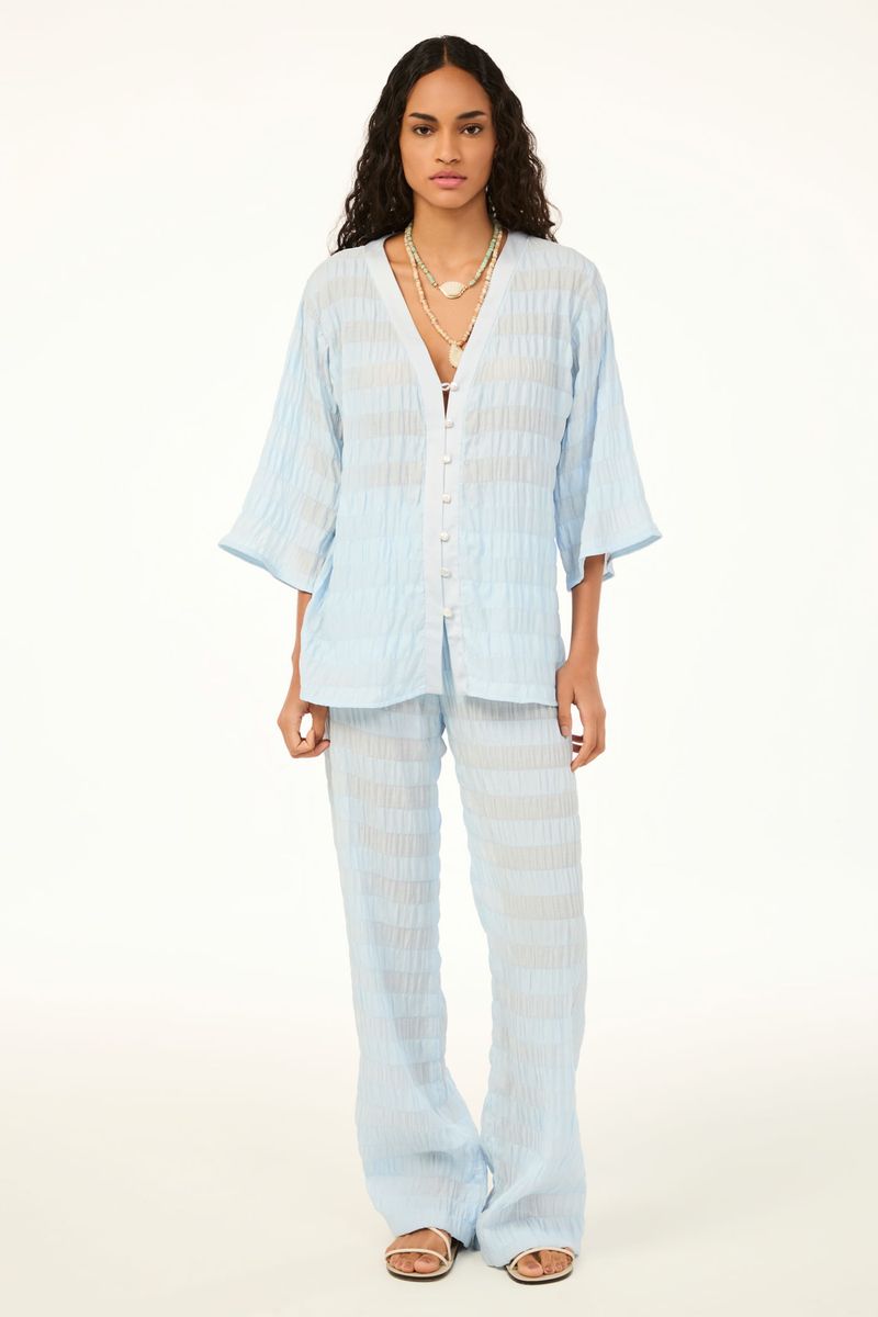 A calca Leah CRIS BARROS é cool e comfy. De Tâmisa, tecido leve, com texturas e fluidez. Possui shape reto, cintura alta, cós com elástico no cós, comprimento longo salto e fechamento por zíper lateral invisível.