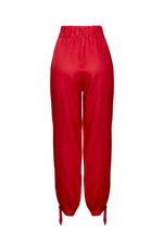 Possui dois bolsos laterais, cós largo com elástico embutido e detalhe de amarração no tornozelo para ajuste.