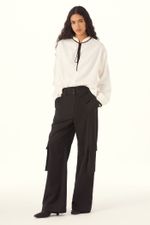 CALÇA DE TECIDO GABARDINE COMPRIMENTO LONGA SALTO E CINTURA LOGO ABAIXO DO UMBIGO. CAIMENTO RETO E COM BOLSOS LATERAIS ESTILO CARGO.