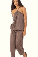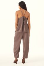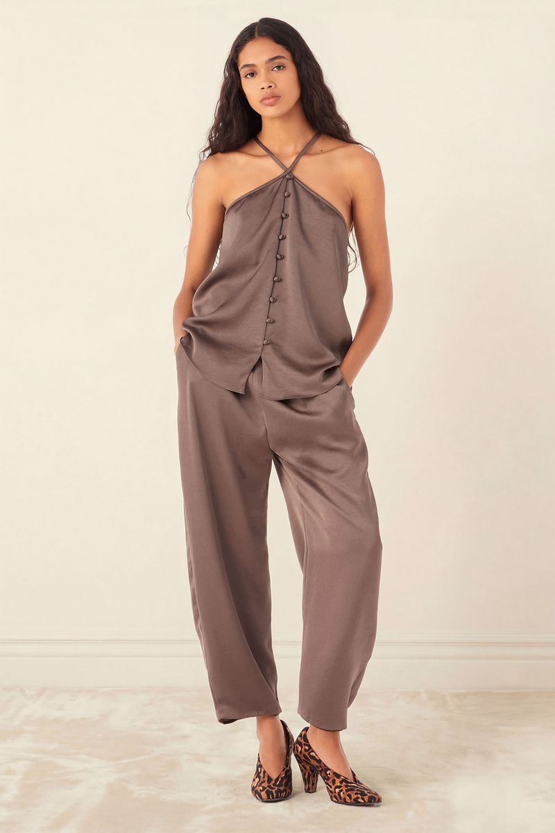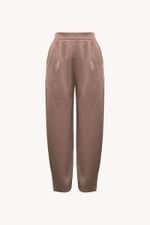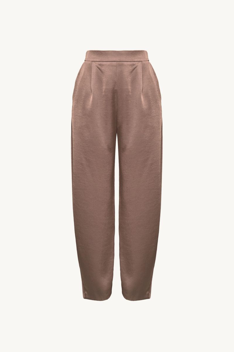 A Calca Lunario traduz uma alfaiataria contemporânea, onde fluidez e precisão caminham lado a lado. Confeccionada em Selene, cetim com brilho suave e estrutura mais encorpada, revela toque muito macio no corpo e fluidez no caimento. A silhueta solta ganha movimento com pregas frontais e bolsos embutidos, enquanto a cintura média, posicionada logo abaixo do umbigo, recebe cós com elástico na parte traseira e o comprimento cropped finaliza a peça com linhas limpas e a assinatura construtiva CRIS BARROS.