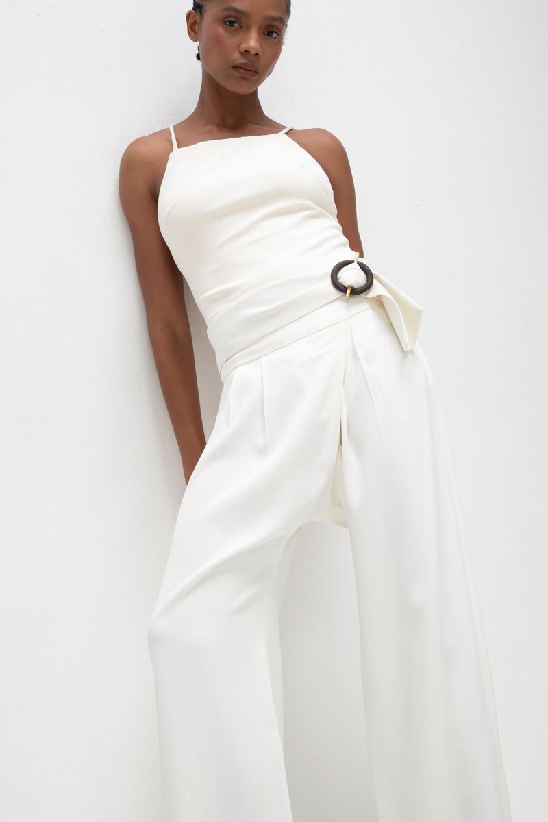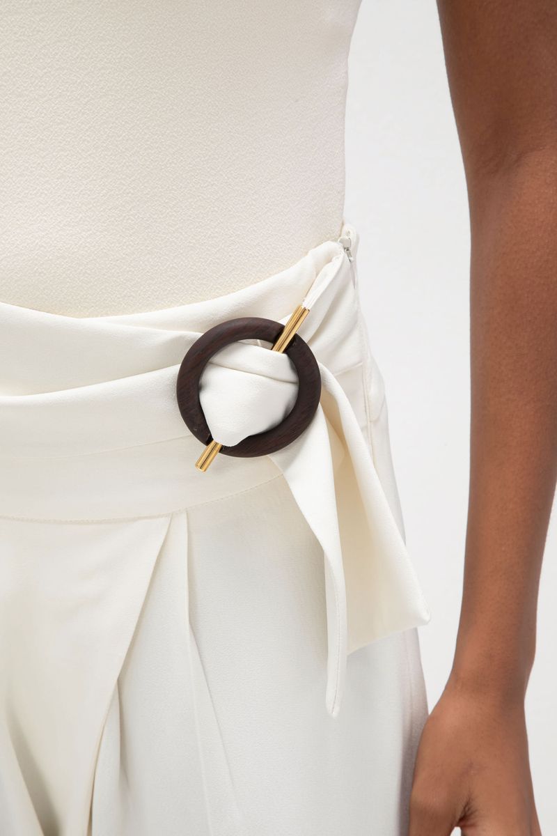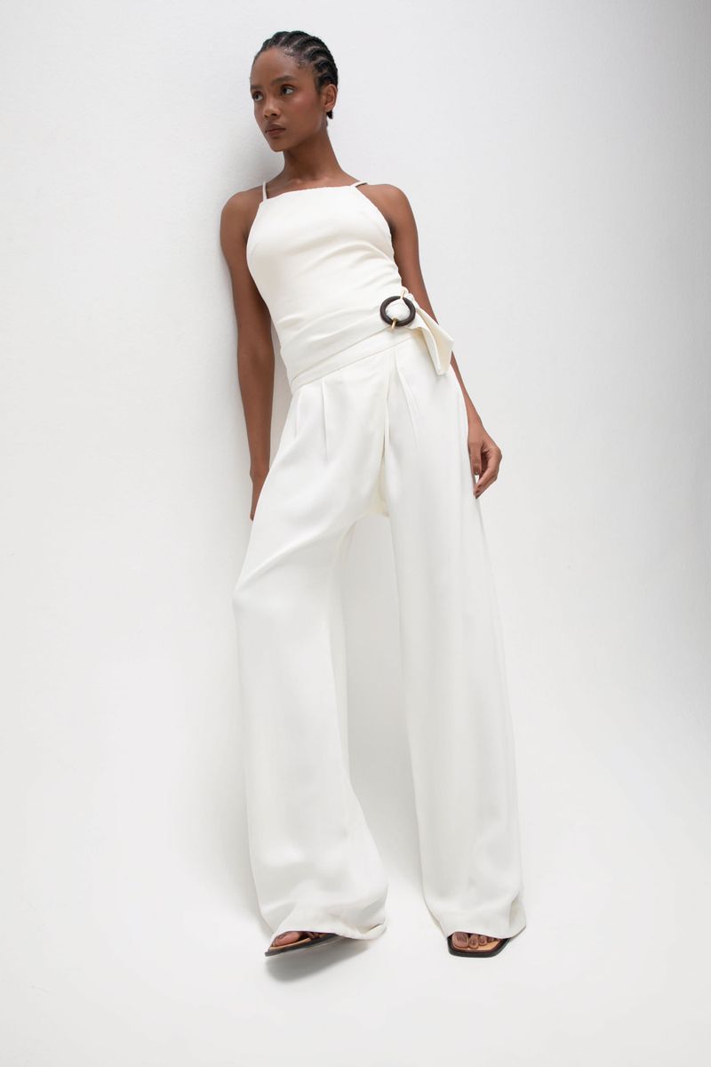 A calca Monet CRIS BARROS é chique e estilosa. De Avalon, nosso tecido clássico, encorpado e fluido, perfeito para alfaiataria e que possui certificação FSC, com maior responsabilidade ambiental, suas fibras são feitas a partir do manejo sustentável de áreas reflorestadas. Possui shape sarouel reto, cintura alta, detalhe com aviamento circular de madeira e alfinete transversal banhado à ouro, que sustentam a lingueta de tecido, comprimento longo salto e fechamento por zíper invisível lateral.