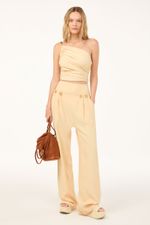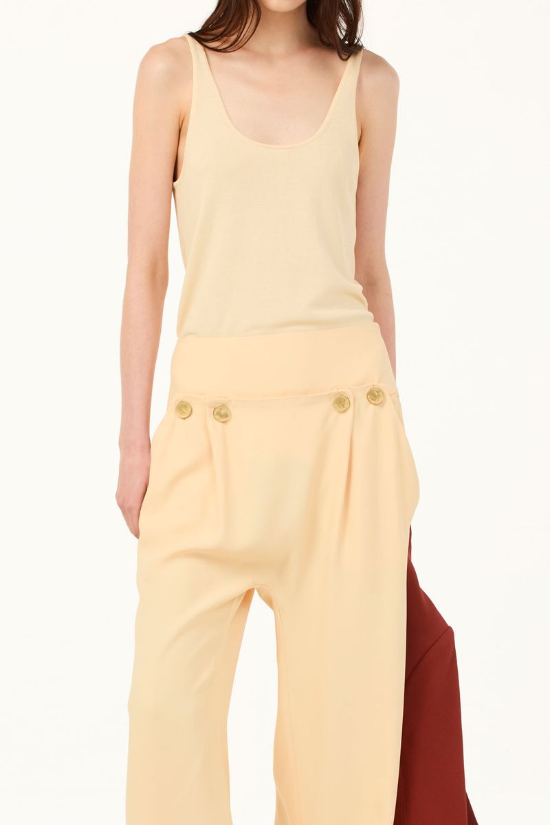A calca Nola CRIS BARROS é elegante e estilosa. De Avalon, nosso tecido clássico, encorpado e fluido, perfeito para alfaiataria e que possui certificação FSC, com maior responsabilidade ambiental, suas fibras são feitas a partir do manejo sustentável de áreas reflorestadas. Possui shape sarouel com pernas retas, cintura alta com pala, detalhe frontal com botões jóia hera redondos de resina, banhados à ouro, design exclusivo desenvolvido em nosso atelier e comprimento longo salto.