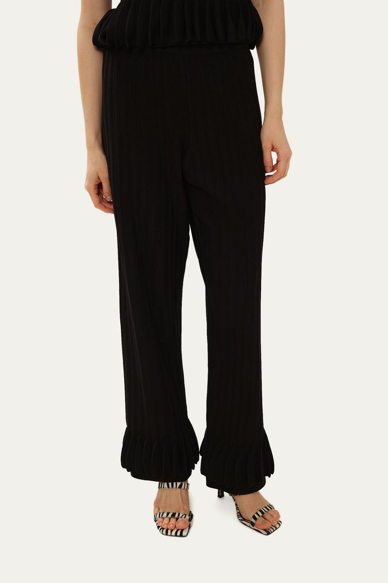 Confeccionada em malha de tricô, esta calça pantalona apresenta nervuras verticais que conferem uma textura sutil e alongam a silhueta. Com cintura alta e cós elástico, oferece um caimento elegante e confortável, complementado por uma barra diferenciada que adiciona um toque de refinamento.