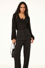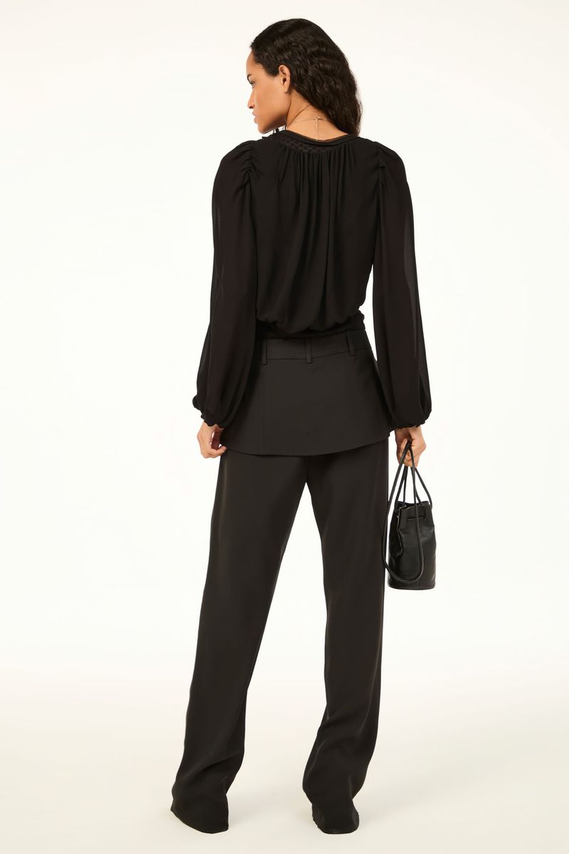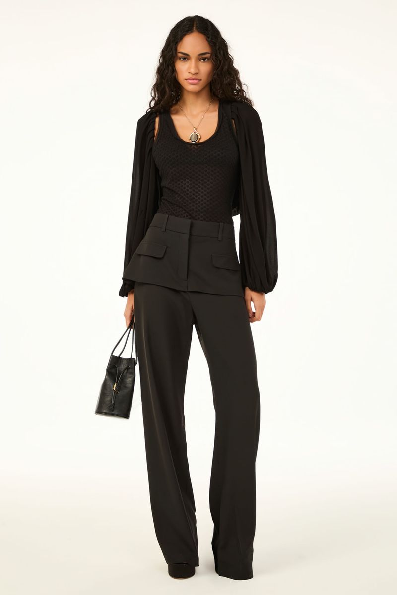 A calca Parati CRIS BARROS é chique e icônica. De Avalon, nosso tecido clássico, encorpado e fluido, perfeito para alfaiataria e que possui certificação FSC, com maior responsabilidade ambiental, suas fibras são feitas a partir do manejo sustentável de áreas reflorestadas. Possui shape reto, cintura logo abaixo do umbigo, cós com passantes, saia sobreposta com lapelas laterais, comprimento longo salto e fechamento por zíper de braguilha e ganchos de alfaiataria.
