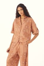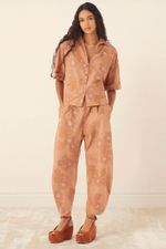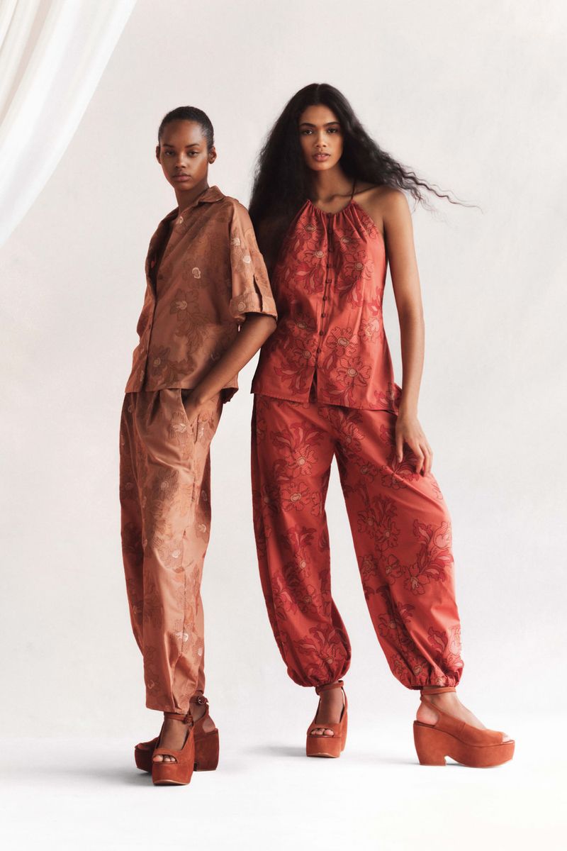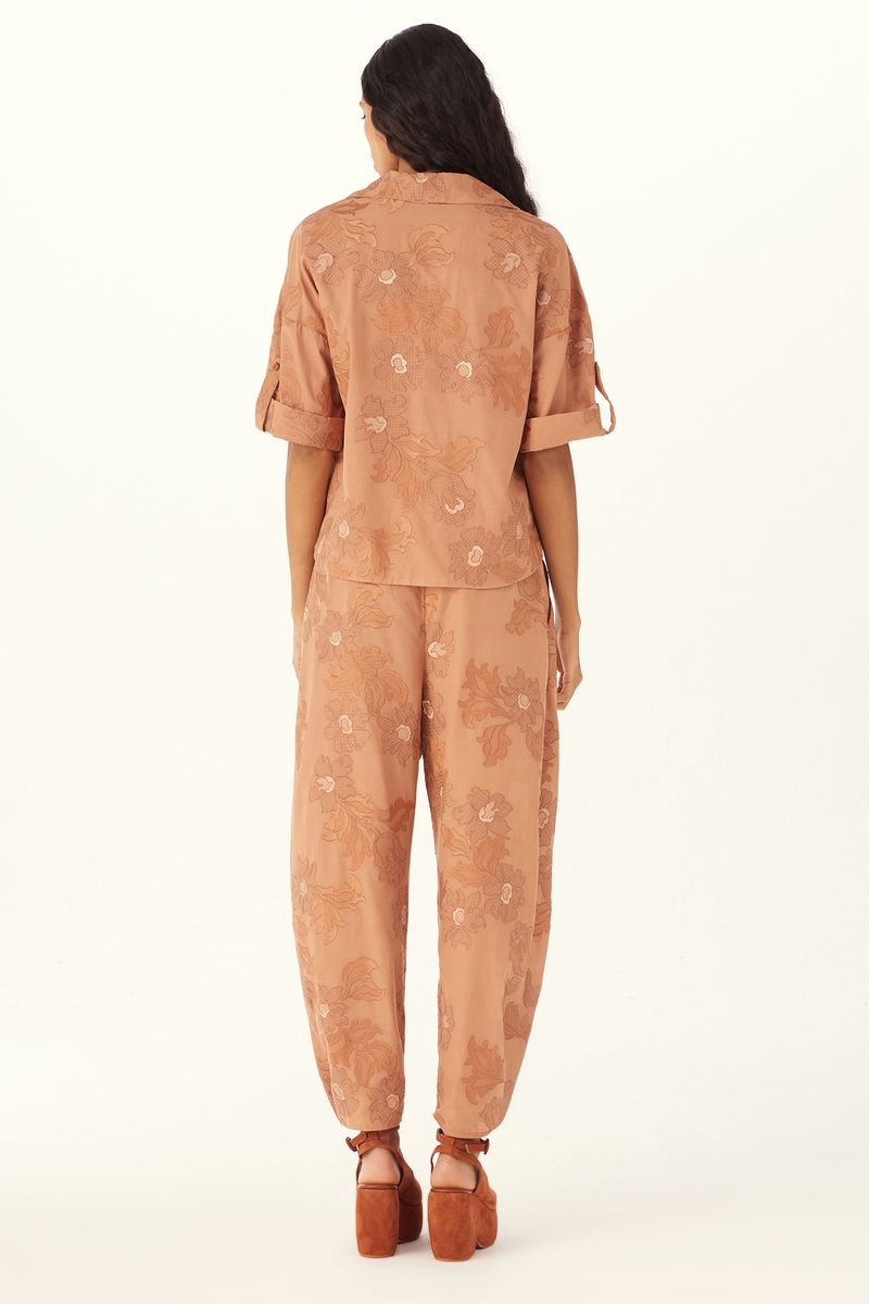 A Calça Rosanna traduz uma leitura contemporânea do conforto com presença, onde textura e construção caminham em equilíbrio. Confeccionada em Acacia, tecido de algodão bordado com flores e folhas orgânicas, construídas a partir de diferentes pontos que criam variações de textura, a botânica dos jardins orientais encontra o olhar decorativo do Ocidente, evocando os interiores de Renzo Mongiardino, onde natureza, ornamento e arquitetura convivem em equilíbrio através de uma leitura gráfica. A modelagem com leve abaulado ganha precisão no comprimento no ossinho, enquanto a cintura média, posicionada logo abaixo do umbigo, recebe cós de elástico e a barra com elástico finaliza o desenho com movimento e linhas limpas, assinatura CRIS BARROS.