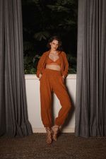 Calça em malha texturizada com padrão geométrico e modelagem ampla. Possui pala sobreposta com acabamento ondulado e recortes diagonais que valorizam o caimento. O cós e as barras são ajustados, criando um contraste entre estrutura e fluidez. Composição: 100% Poliéster