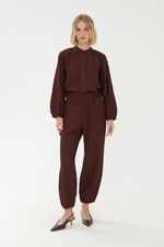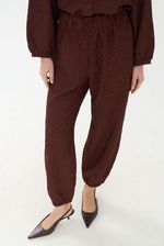 Calça em tecido texturizado com toque leve. Modelagem levemente abaulada. Cintura alta. Cós e barra com elástico embutido. Não possui bolsos. Padronagem geométrica. Não possui fechamento.