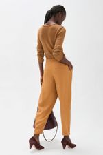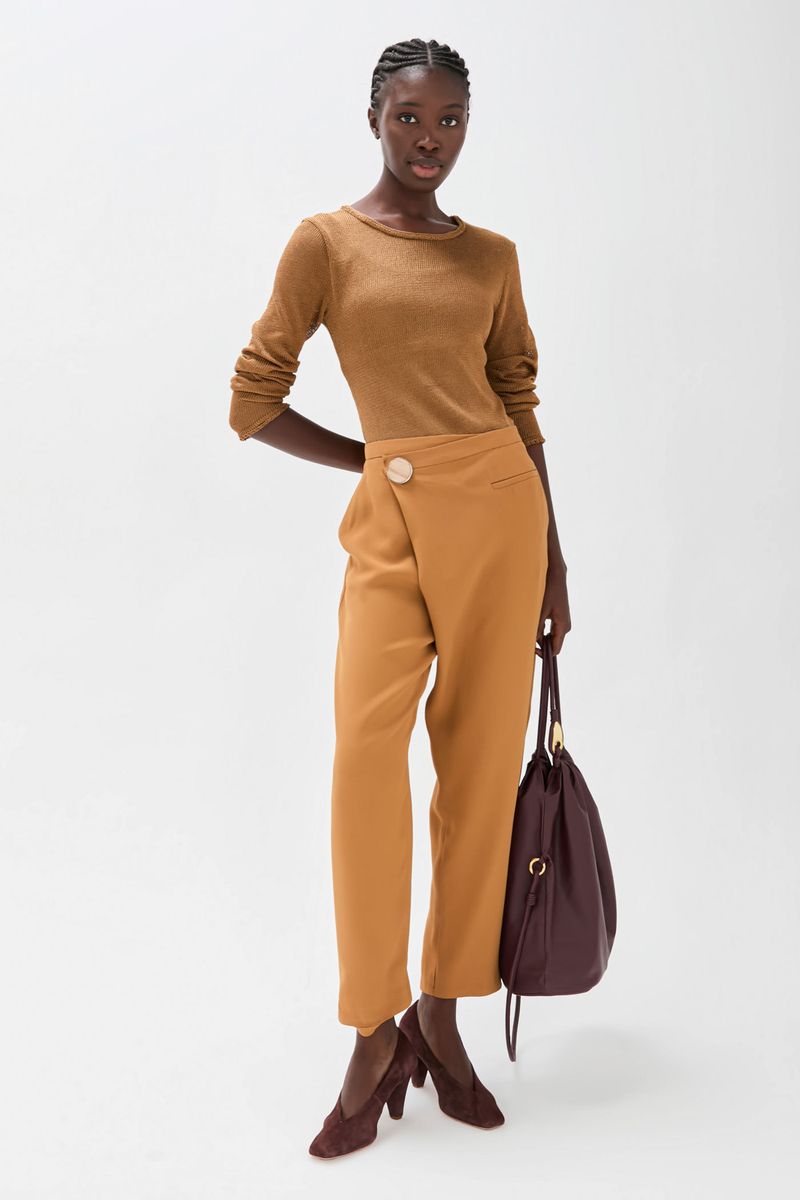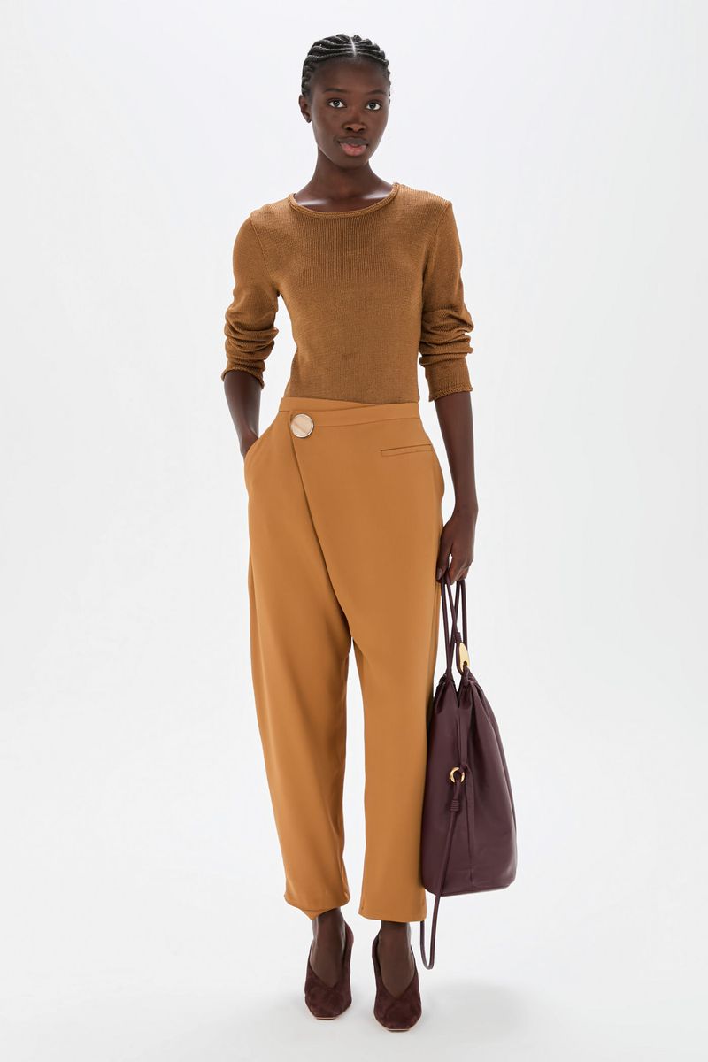 A calca Vidal CRIS BARROS é chique e estilosa. De Avalon, nosso tecido clássico, encorpado e fluido, perfeito para alfaiataria e que possui certificação FSC, com maior responsabilidade ambiental, suas fibras são feitas a partir do manejo sustentável de áreas reflorestadas. Possui shape cenoura, vista transpassada, cintura alta, bolsos laterais posteriores, comprimento cropped, fechamneto por zíper lateral invisível e detalhe especial com botão jóia circular, design exclusivo desenvolvido em nosso atelier, com resina que imita pedra.