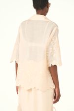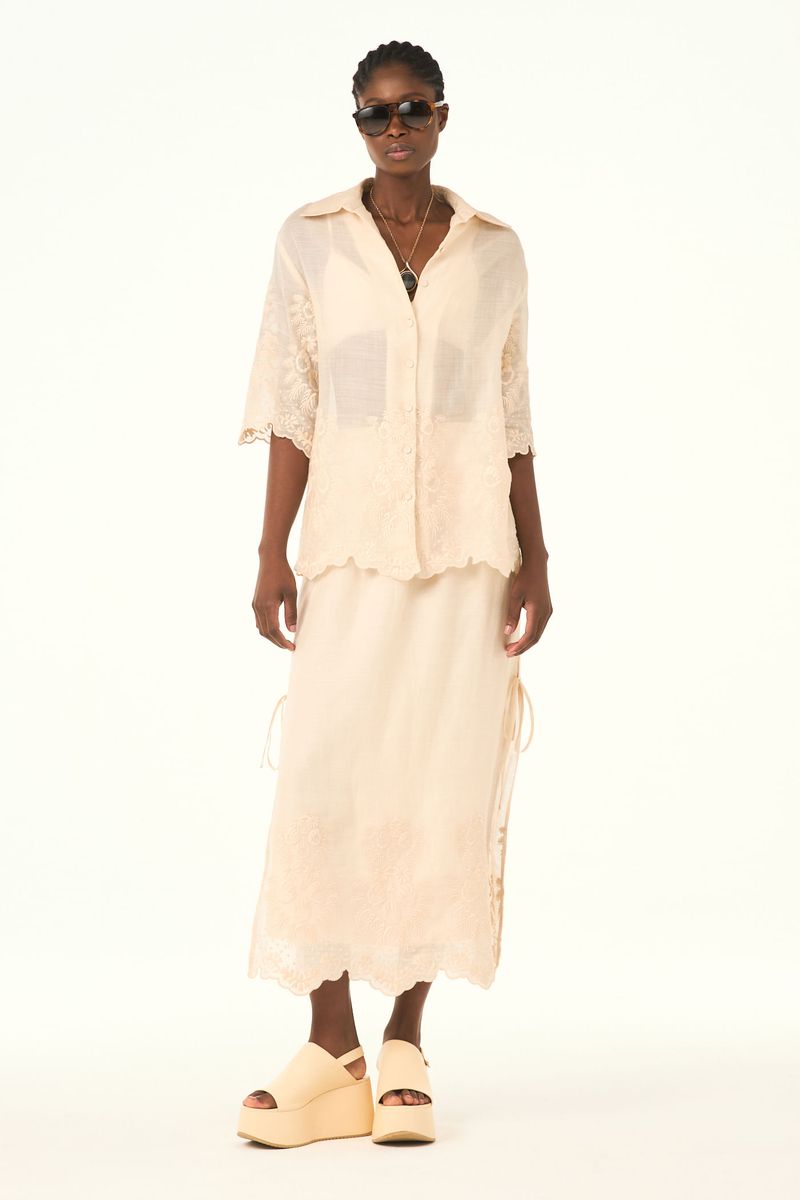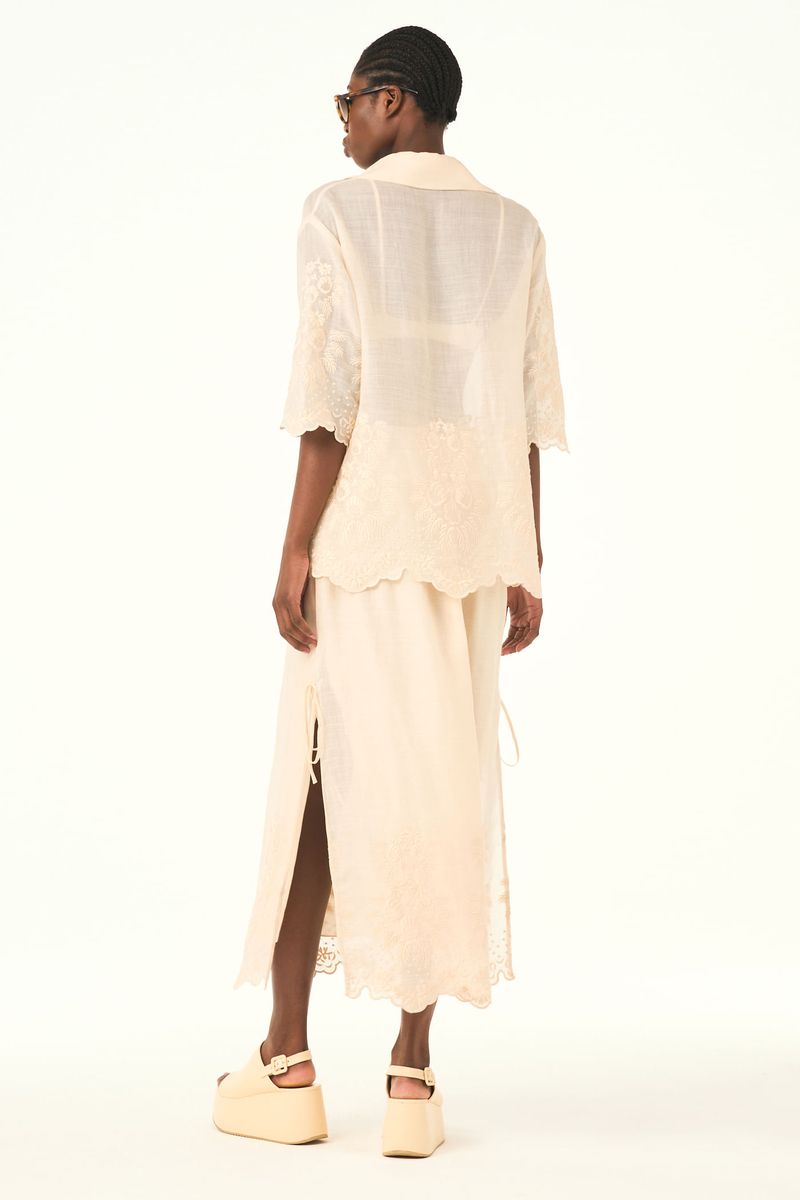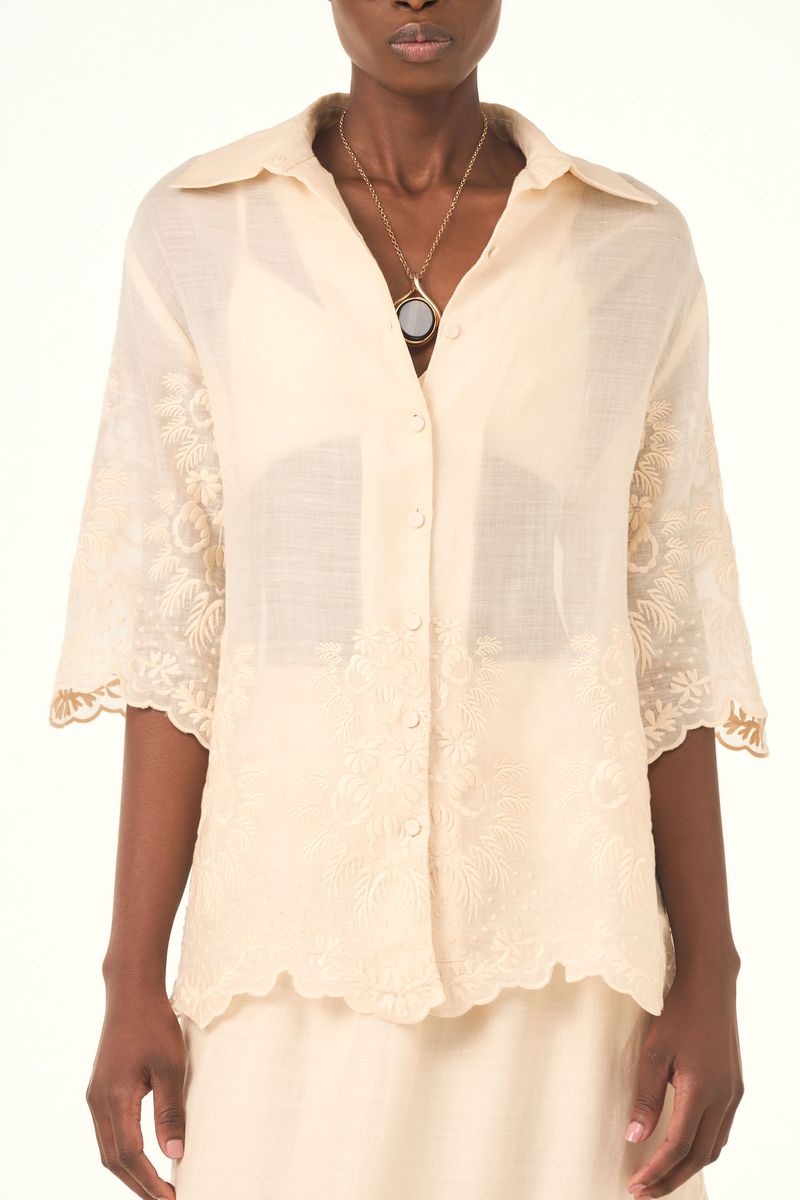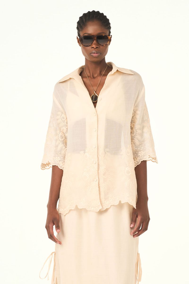 A camisa Agata CRIS BARROS é cool e chique. DDe Maeve, tule de linho 100% com renda localizada delicadamente bordada, acabamento festonê e barrado cortado à laser. Possui shape reto e solto, mangas curtas, botões forrados e comprimento alongado.