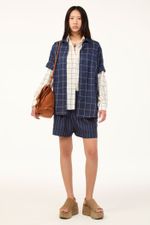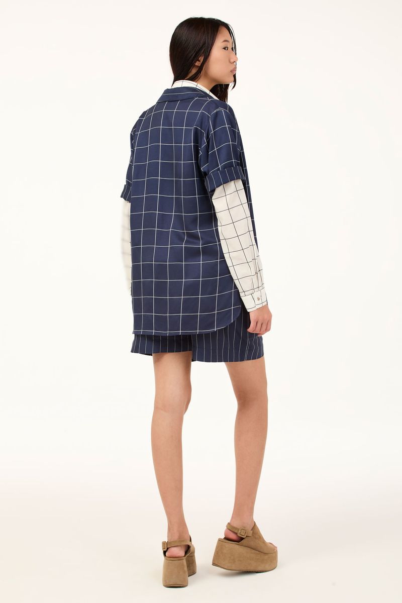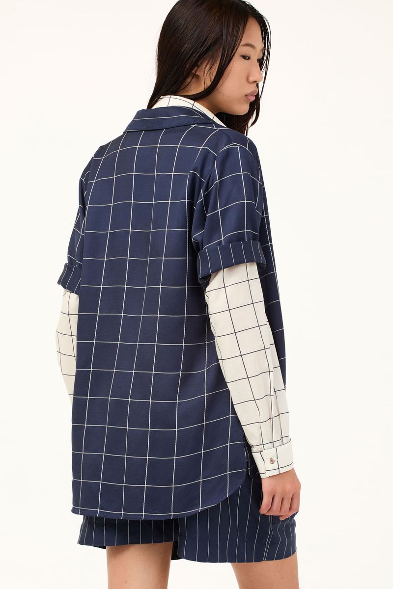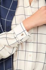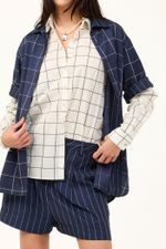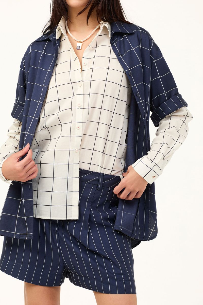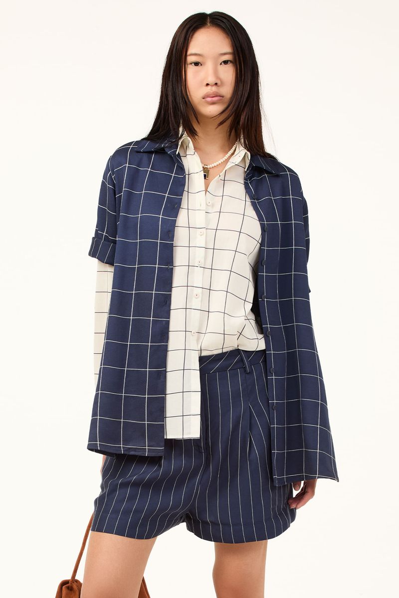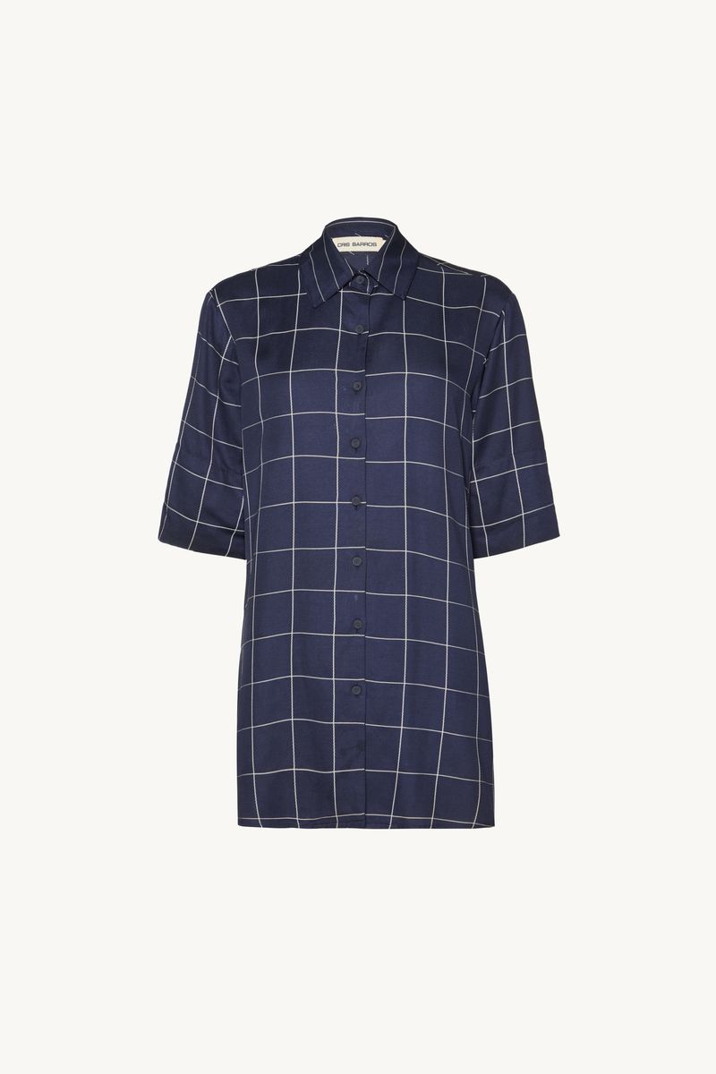 A camisa Biarritz CRIS BARROS é cool e estilosa. De Biarritz, tecido risca de giz e xadrez, exclusivo, com toque acetinado e perfeito para alfaiataria. Possui shape reto, mangas curtas e botões forrados.