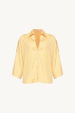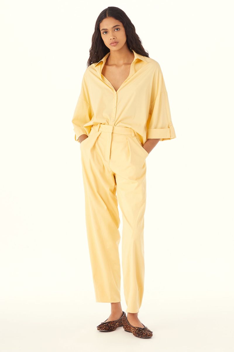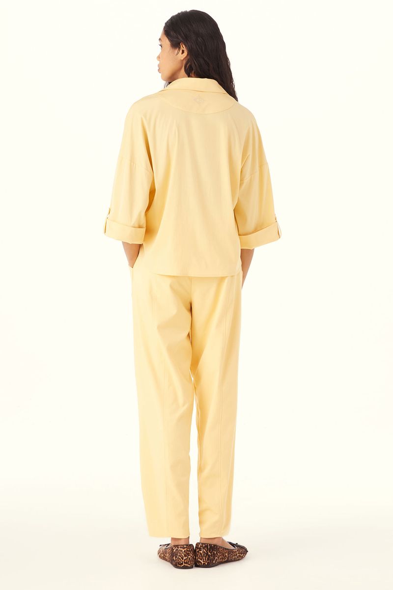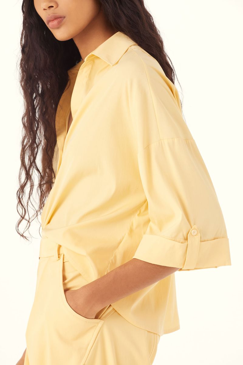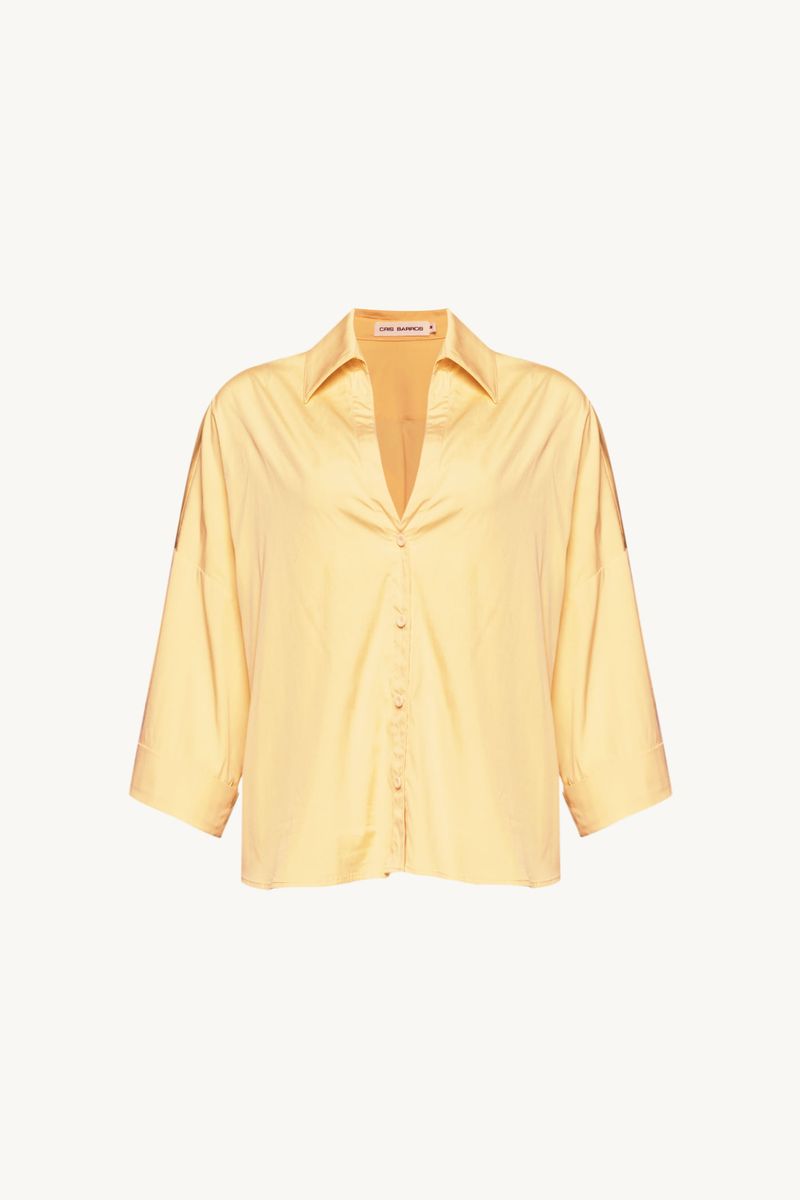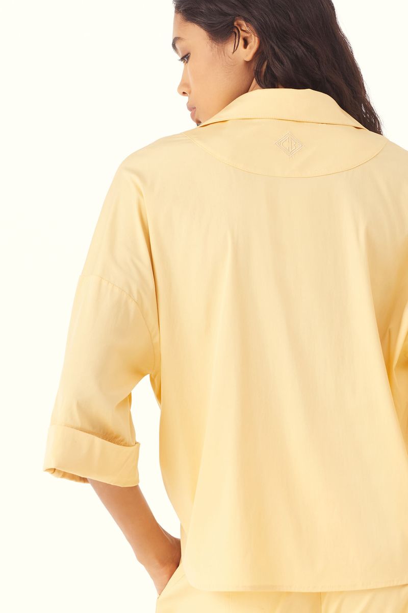 A Camisa Evonne traduz uma presença discreta e contemporânea, onde leveza e traços modernos caminham lado a lado. Confeccionada em Eugênia, tecido em TENCEL™Modal, feito com fibra renovável de manejo florestal certificado e tecnologia ecoeficiente de ciclo fechado que recircula água e solventes. O decote V e o comprimento normal conduzem uma leitura precisa, enquanto a manga curta com dobra na barra, martingale e botão forrado na lateral soma intenção ao gesto, a vista com fechamento de botões forrados chatos reforça o acabamento limpo, e o bordado CB com losango na meia-lua do decote costas evidencia a assinatura CRIS BARROS.