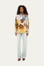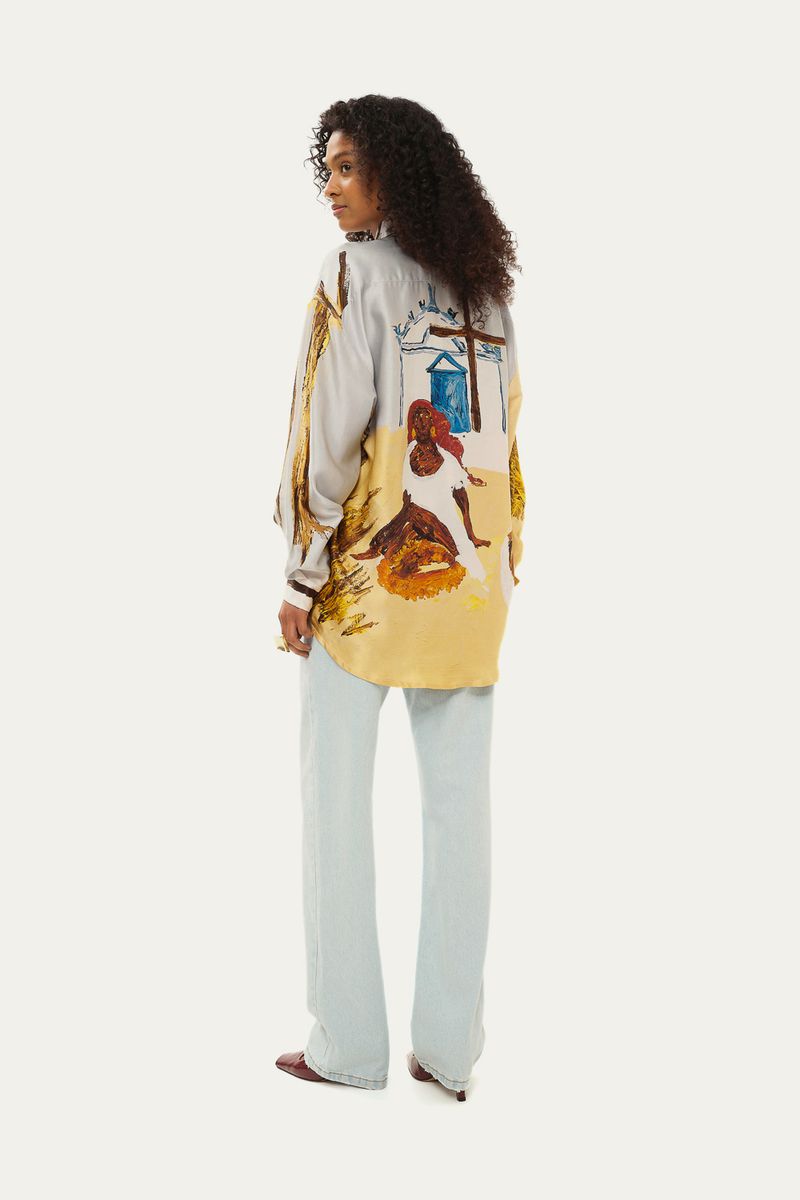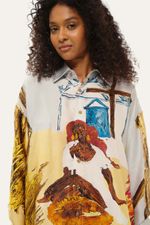 Confeccionada em luxuoso cetim de seda estampado, a camisa revela uma temática artística vibrante. Seu design, pautado pela sofisticação e pelo fechamento em botão caseado, confere um toque de elegância discreta e singularidade à peça, ideal para quem busca a união entre arte e conforto.
