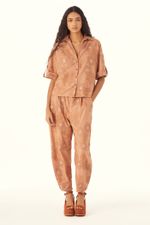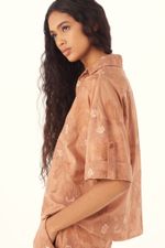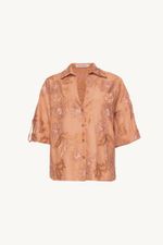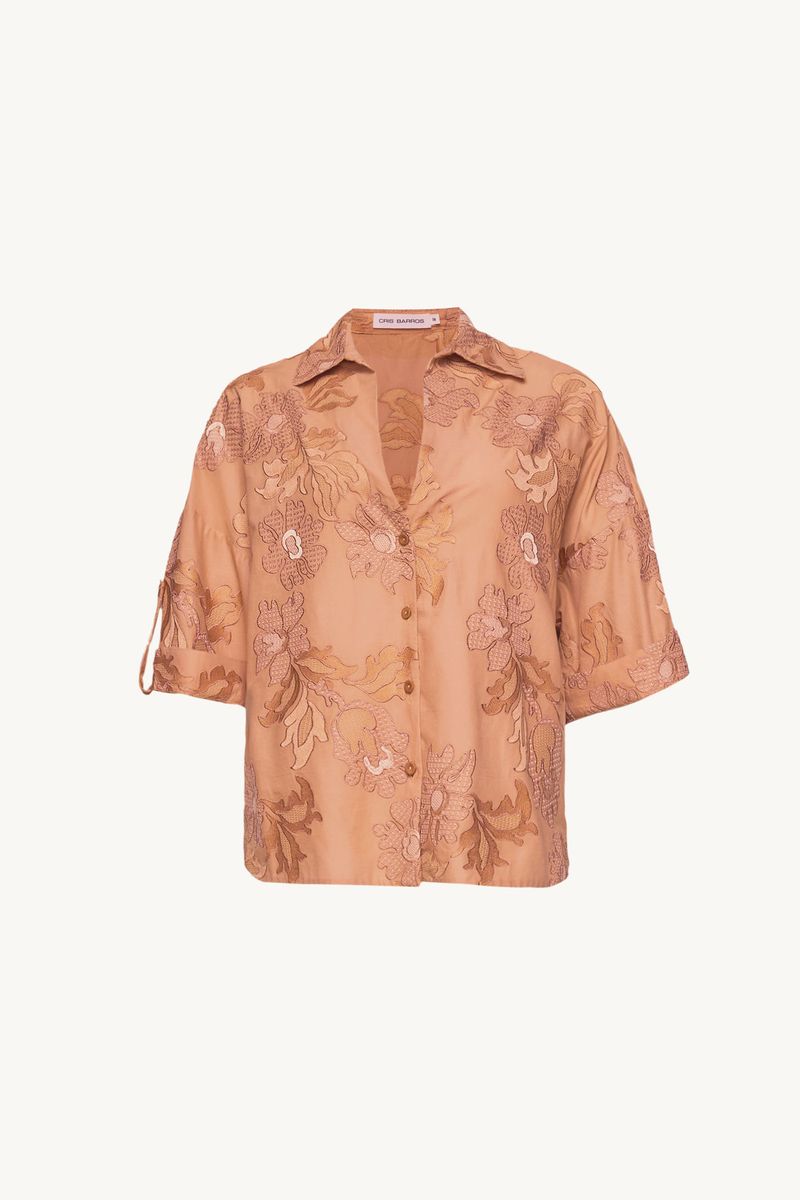 A Camisa Marie traduz uma modernidade precisa, onde o gesto artesanal encontra traços contemporâneos. Confeccionada em Acacia, tecido de algodão bordado com flores e folhas orgânicas, construídas a partir de diferentes pontos que criam variações de textura, a botânica dos jardins orientais encontra o olhar decorativo do Ocidente, evocando os interiores de Renzo Mongiardino, onde natureza, ornamento e arquitetura convivem em equilíbrio através de uma leitura gráfica. O decote em V e o comprimento normal desenham um shape direto, enquanto a manga curta ganha detalhe de dobra na barra com martingale e botão forrado na lateral, combinados à vista com fechamento por botões forrados chatos que finaliza a peça com acabamento preciso e assinatura CRIS BARROS.