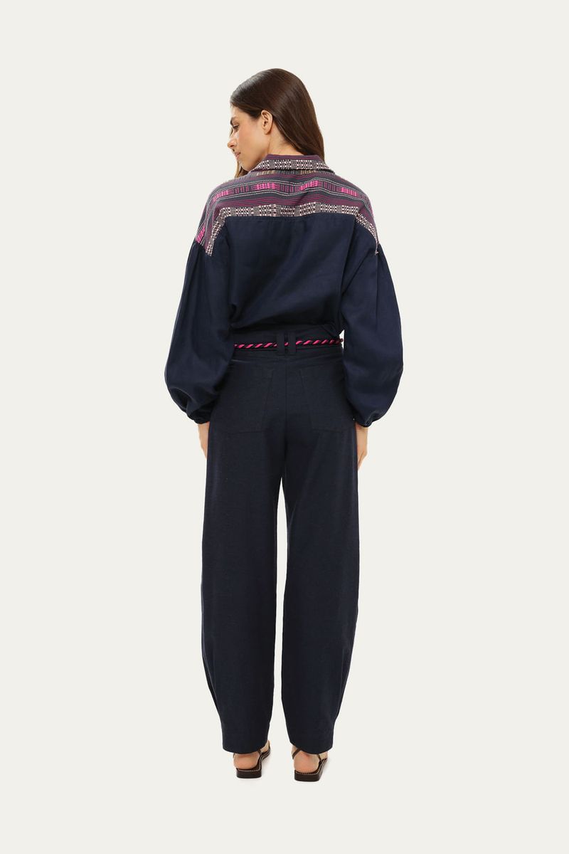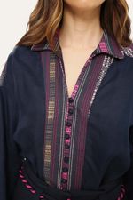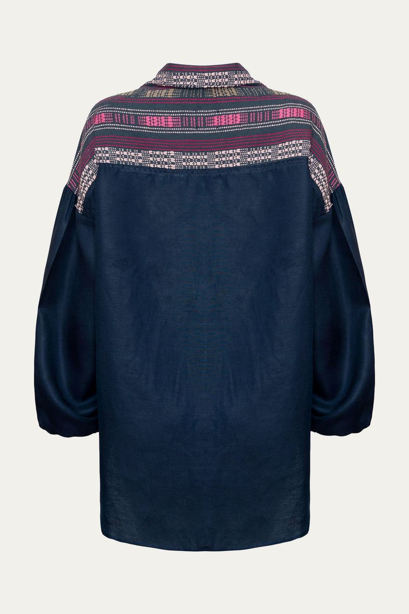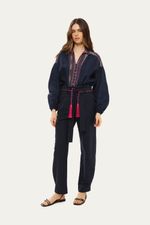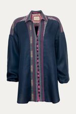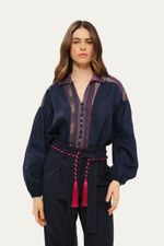Confeccionada em viscose, possui detalhe de vista, gola e pala em tear manual.