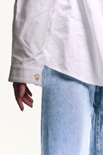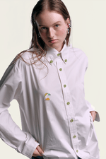 Camisa unissex e oversized em nobre tricoline 100% algodão encorpada de toque macio.. Bordado de pato na altura do peito e nos punhos. Gola clássica. Fechamento por botões verdes.