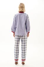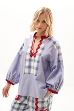 Camisa alongada, com manga levemente bufante , decote v e aplicação de vivo.
