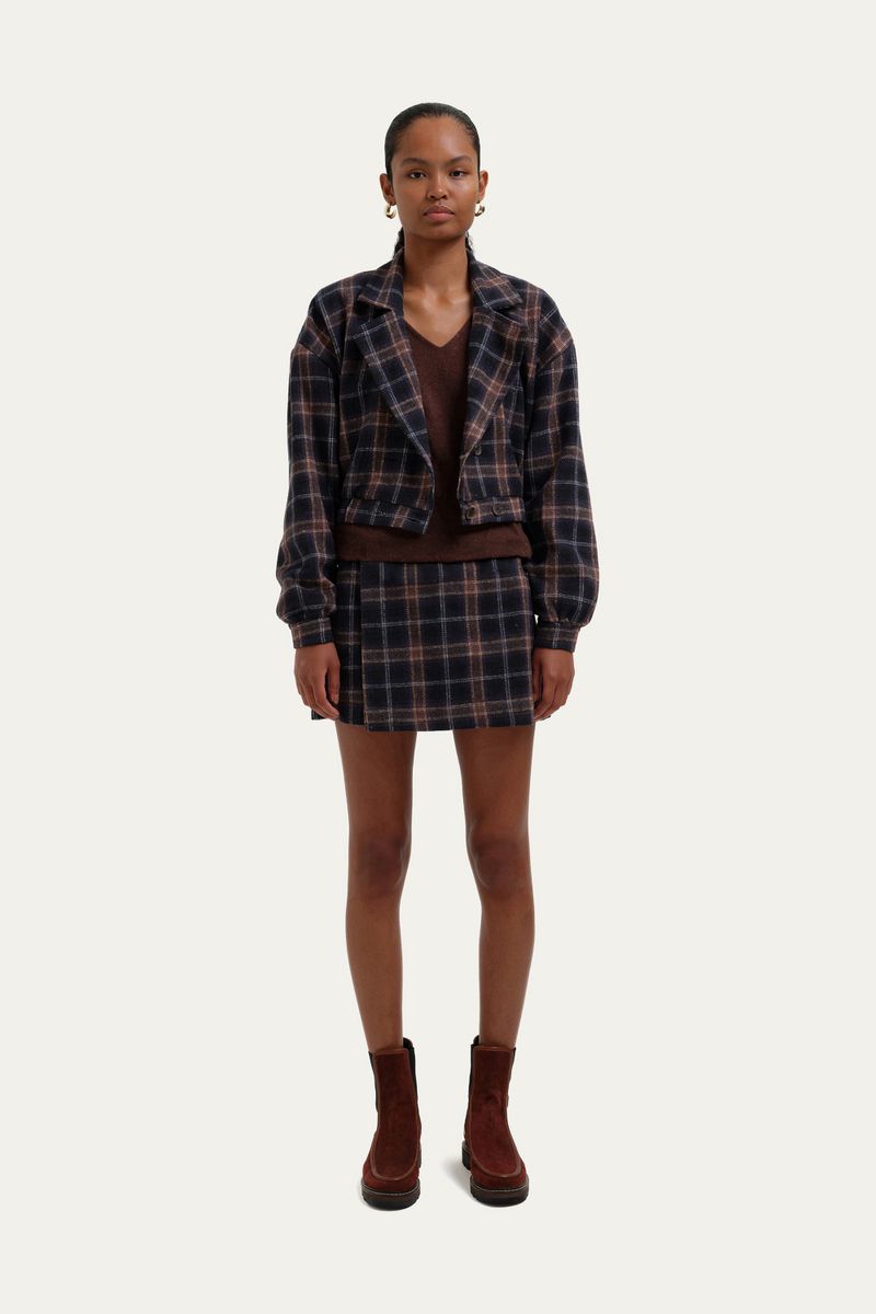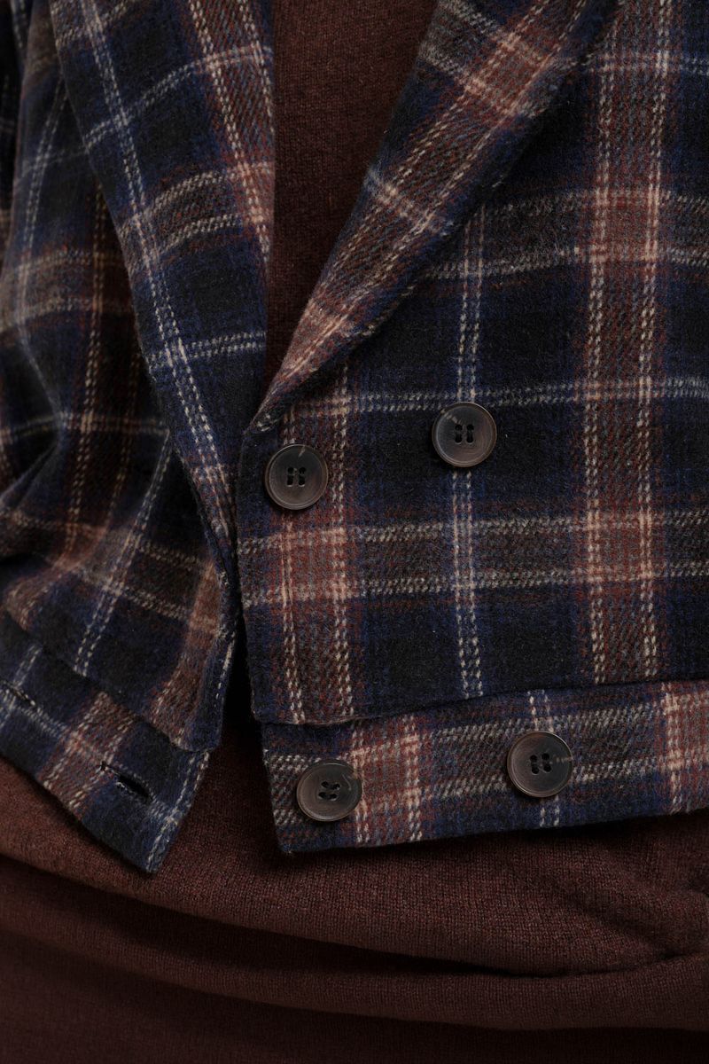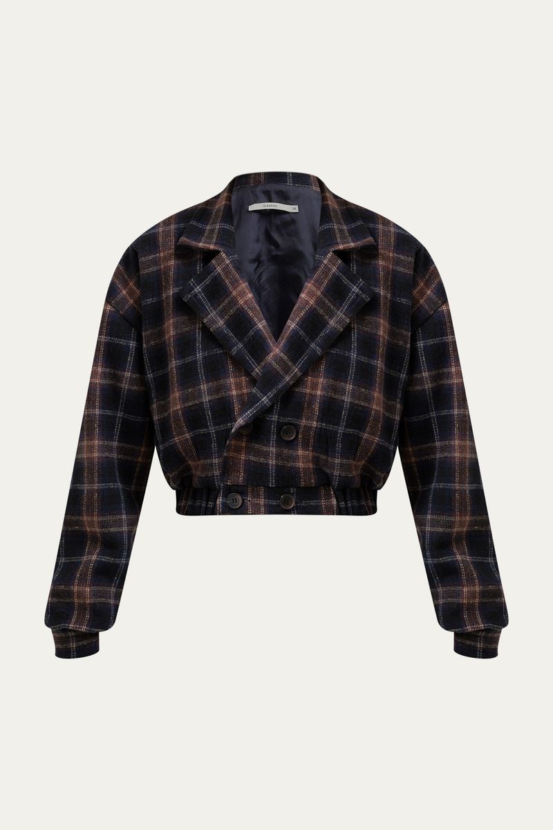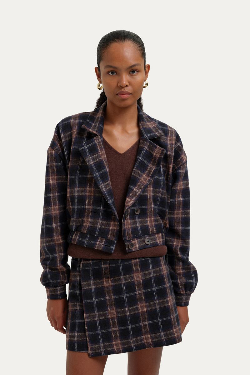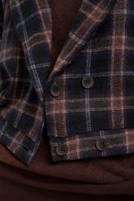 O Casaco Drummor Clemence revela uma padronagem xadrez clássica. Detalhes como a gola de lapela ampla e o decote em V transpassado adicionam uma nota de refinamento. As mangas longas, com seu leve volume e punhos ajustados, complementam o design encurtado, que se finaliza com o fechamento frontal por botões aparentes, delineando uma silhueta distintiva.