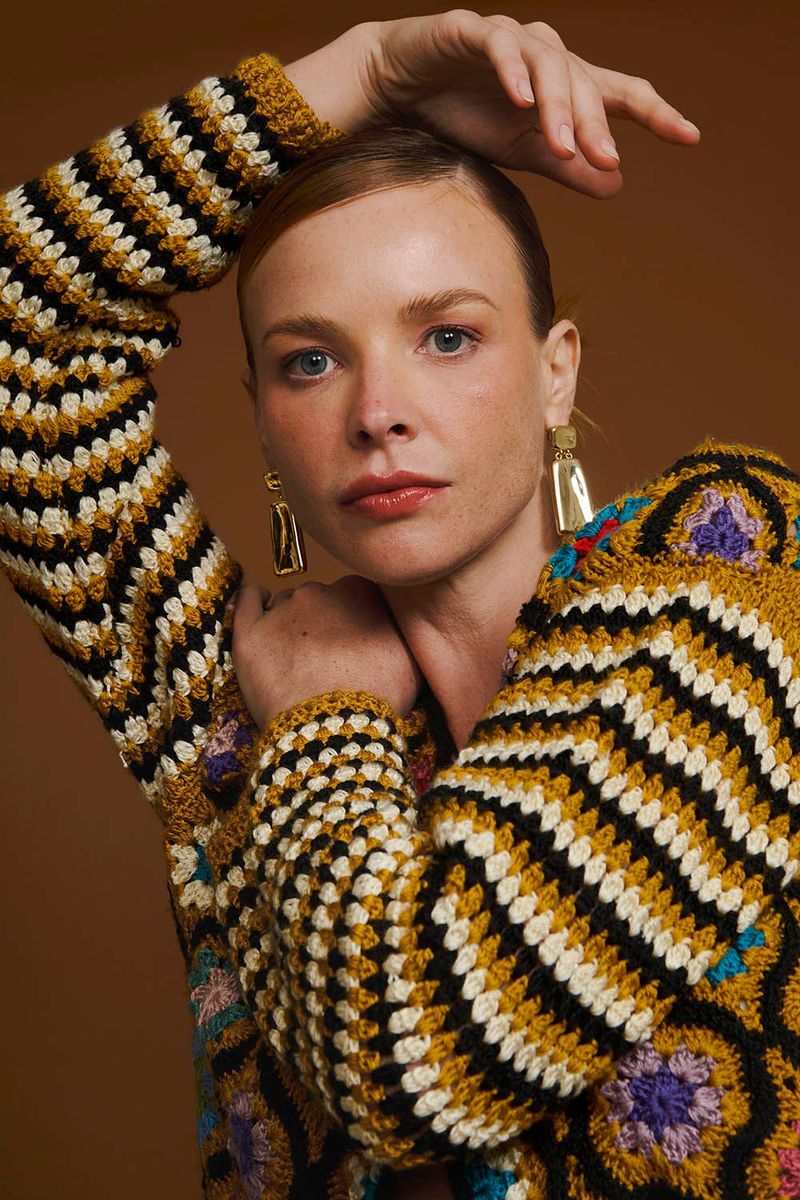 Feito à mão com squares coloridos em crochê, o casaqueto HOUSTON combina o charme artesanal com um toque contemporâneo. As mangas listradas trazem um contraste moderno, enquanto os tassels finalizam a peça com originalidade.