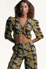 Casaqueto de Jacquard dupla face (preto de um lado e amarelo do outro) com amarrações frontais duplas. Manga bufante. Tecido exclusivo confeccionado a partir de nossa estampa.