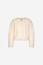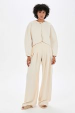 O casaqueto Kelly CRIS BARROS é clássico e estiloso. De Aime, tecido mais sustentável, encorpado e com texturas irregulares, perfeito para alfaiataria. Possui shape cropped assimétrico, mangas longas volumosas e aviamento jóia, banhado à ouro, em formato de coração, design exclusivo desenvolvido em nosso atelier, para seu fechamento.