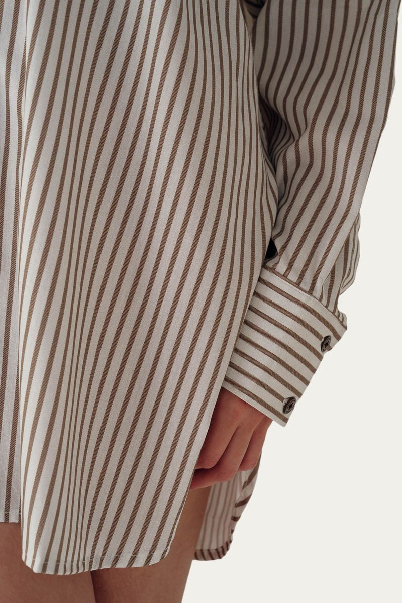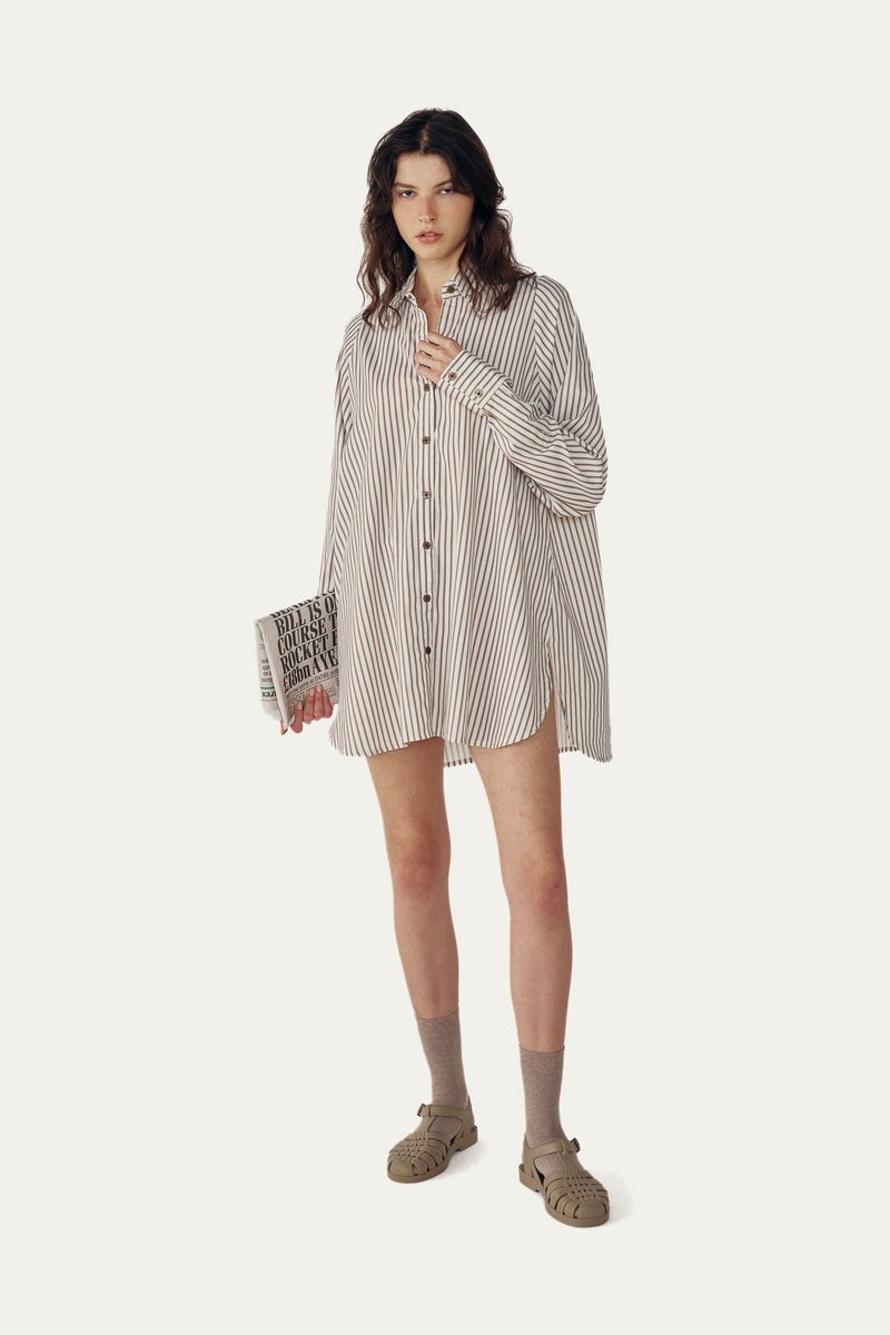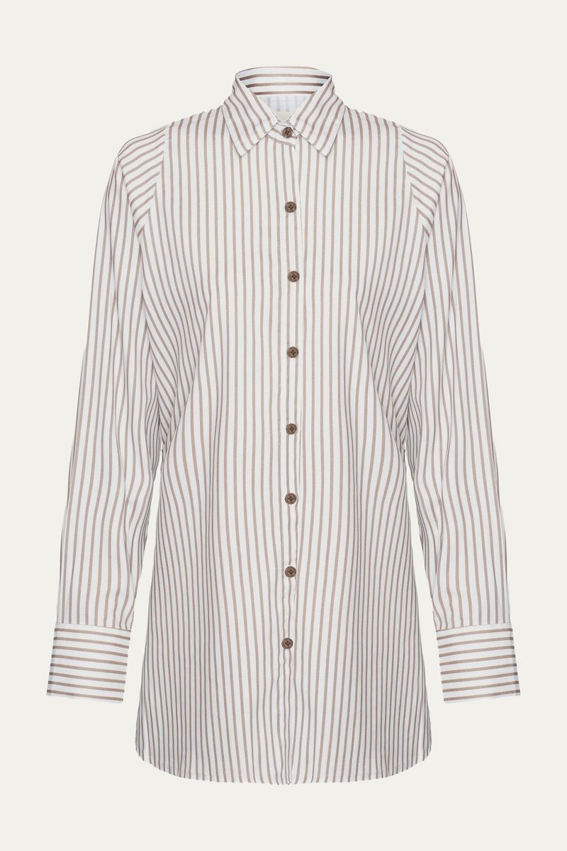 Chemise ampla com manga longa. Fechamento por botões tingidos. Possui fenda lateral. Composição: 53% Algodão, 38% Viscose, 9% linho.