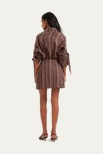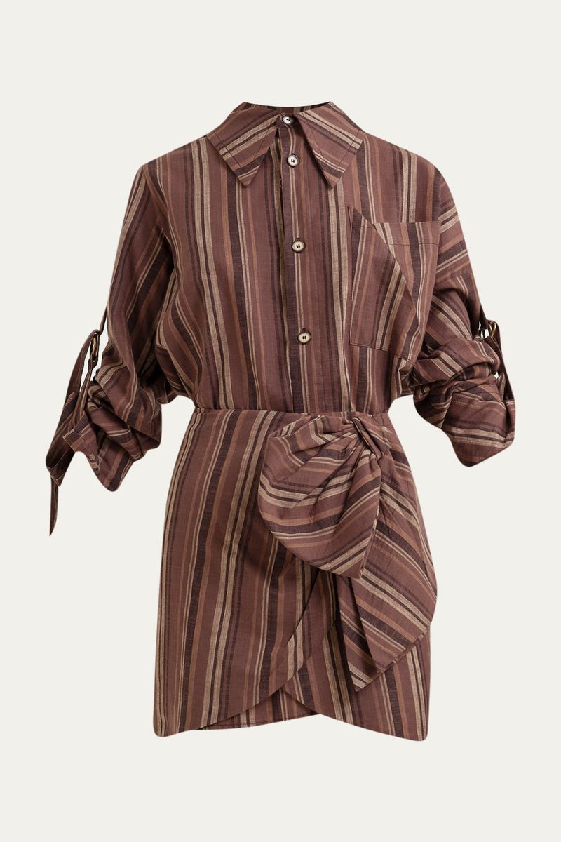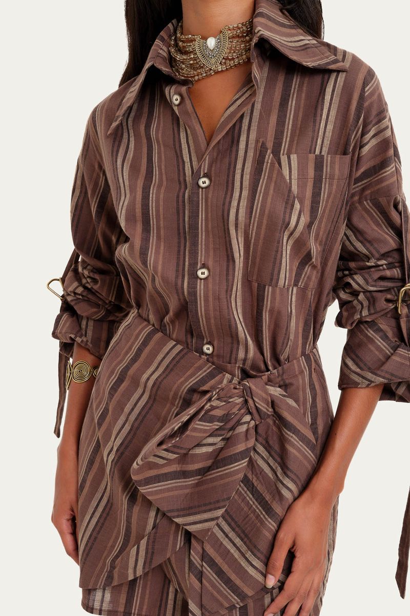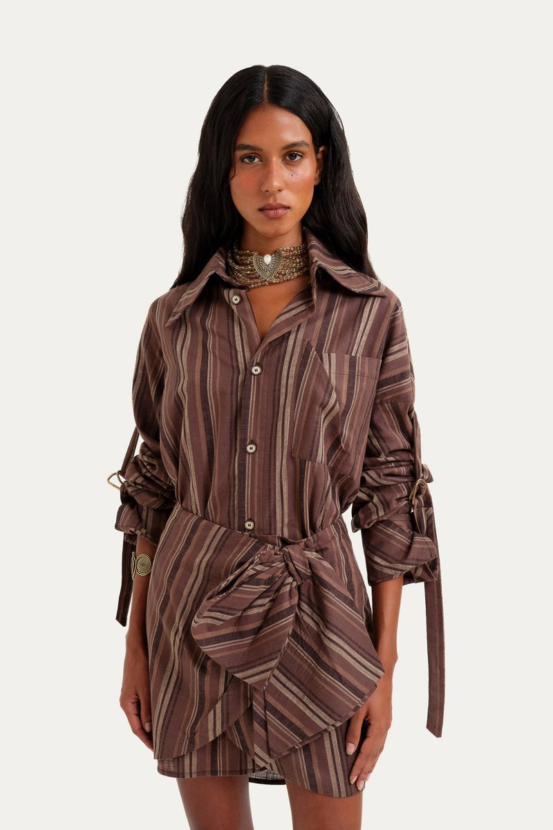 A chemise Ritz Framed em listras apresenta uma silhueta de modelagem reta alongada, complementada por gola colarinho e mangas compridas com punhos ajustados por fivela, conferindo um caimento refinado. Acompanha um mini pareô no mesmo tecido, adicionando versatilidade à peça.