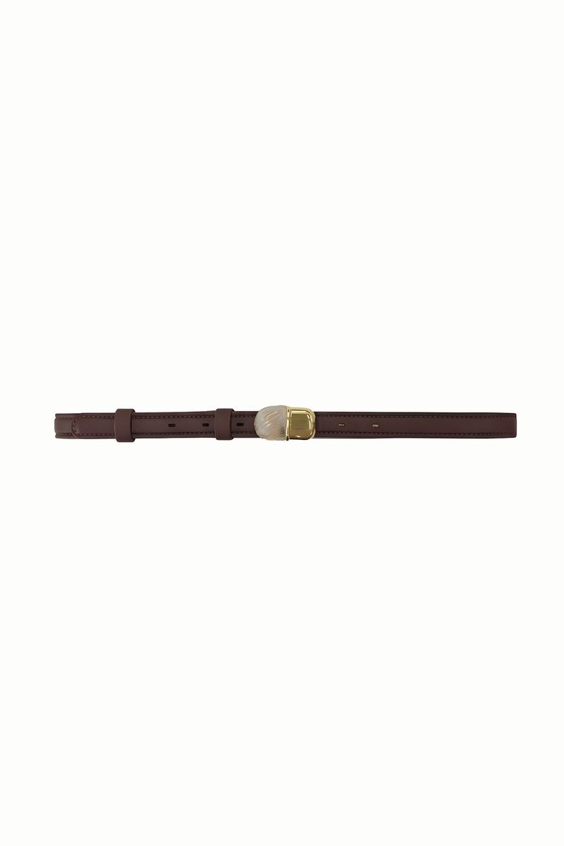 CINTO CONFECCIONADO EM COURO COM 2CM DE LARGURA, CORPO COM PERFURAÇÕES PARA AJUSTE PODENDO SER USADO NA ALTURA DA CINTURA E DO QUADRIL, ACABAMENTO COM PESPONTOS, FECHAMENTO FRONTAL COM PINO. FIVELA COM DESIGN EXCLUSIVO DA MARCA EM METAL BANHO OURO CLARO COM RESINA.