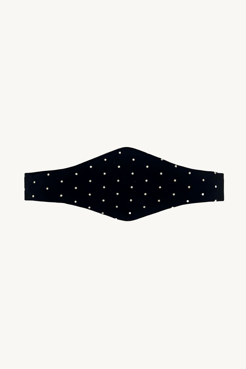 CINTO DE VELUDO BORDADO COM FORRO DE COURO, FECHAMENTO DE BOTÕES DE PRESSÃO E ELÁSTICO FORRADO DE VELUDO NAS COSTAS.