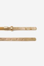 cinto simone CRIS BARROS é cinto produzido em metal retorcido pigmentado ouro claro de 1cm, com fivela ouro claro ornamentada com resinas off white com pó de mármore. fechamento ajustável com pinos no centro costas feito em couro metalizado