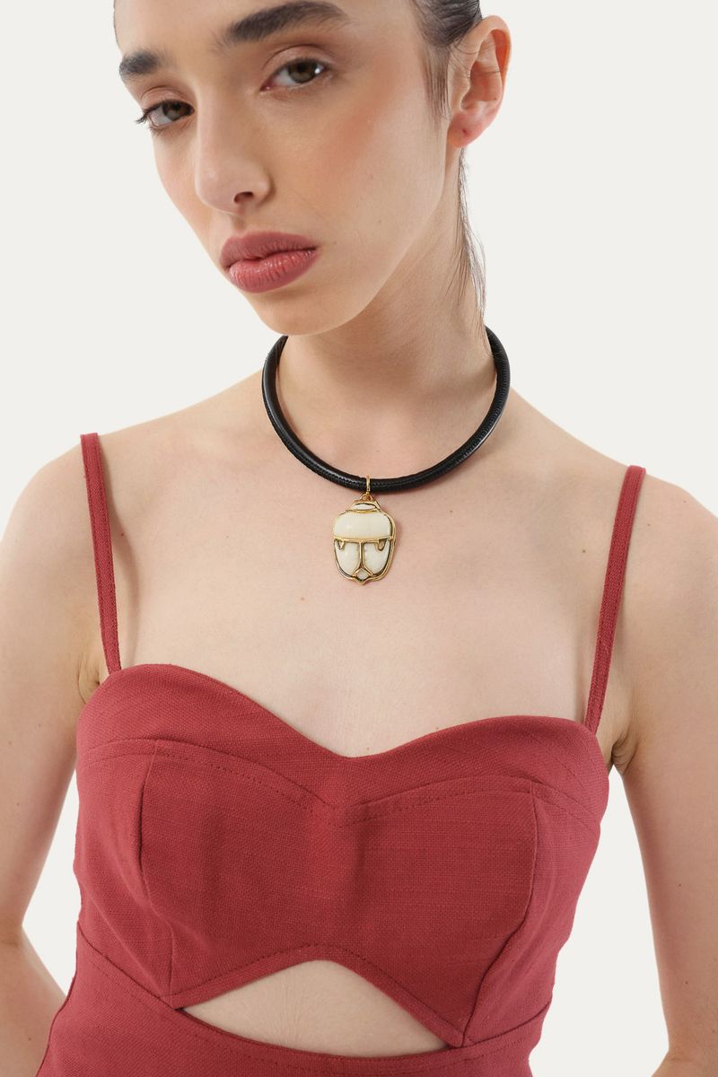 O Colar Couro Escaravelho Rosana Bernardes é uma peça de design exclusivo, combinando a durabilidade do couro com o simbolismo atemporal do escaravelho. Este acessório sofisticado e versátil confere um toque de proteção e renovação ao seu visual. Ideal para quem busca personalidade e elegância duradoura.